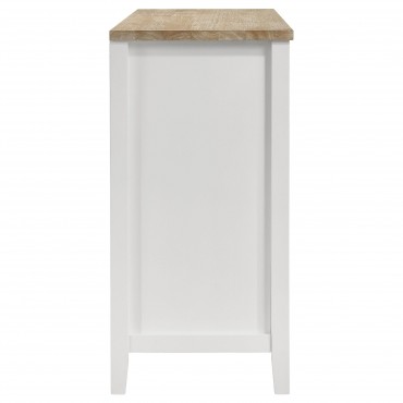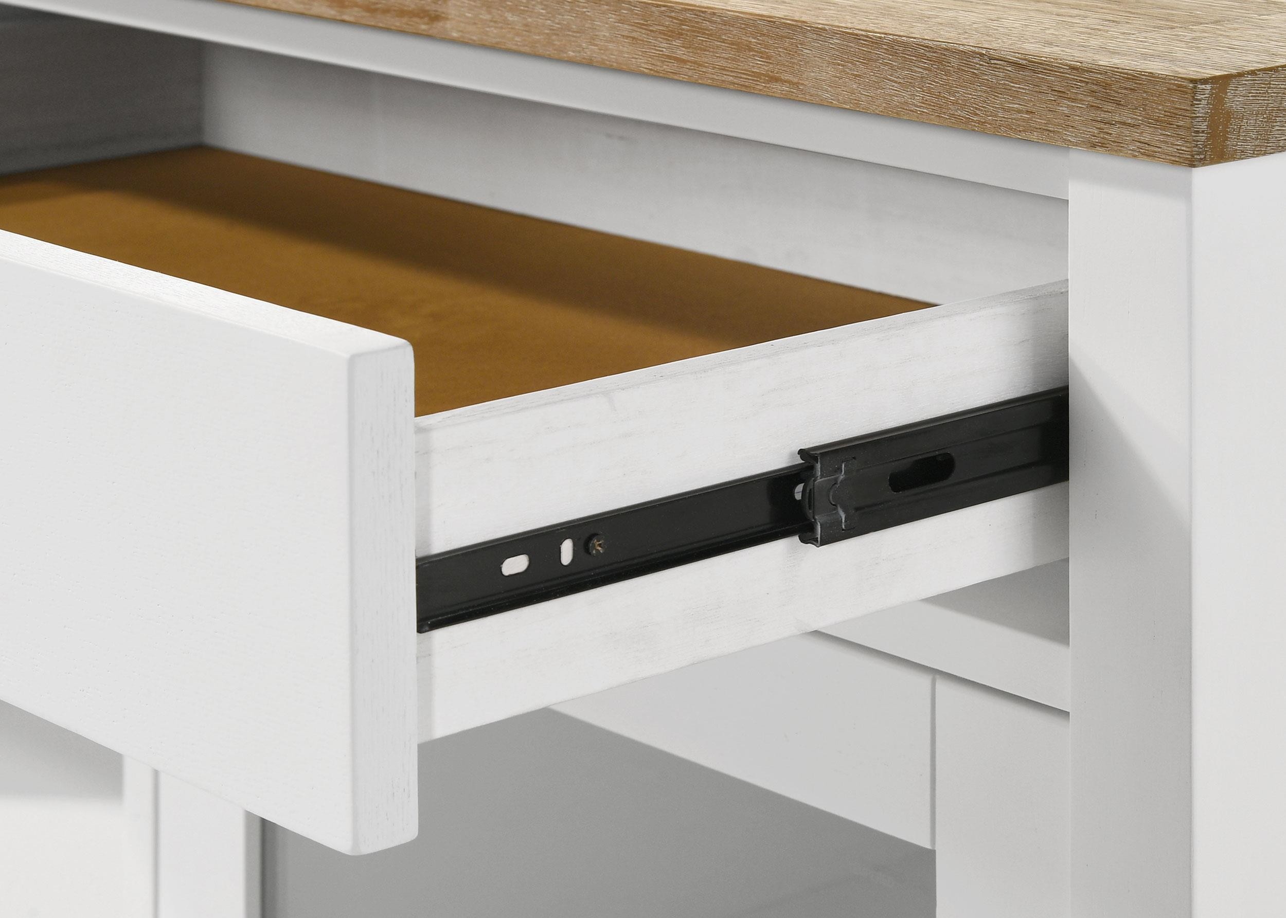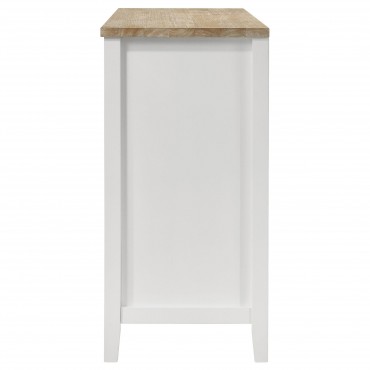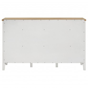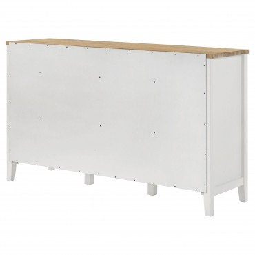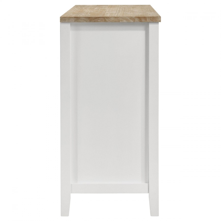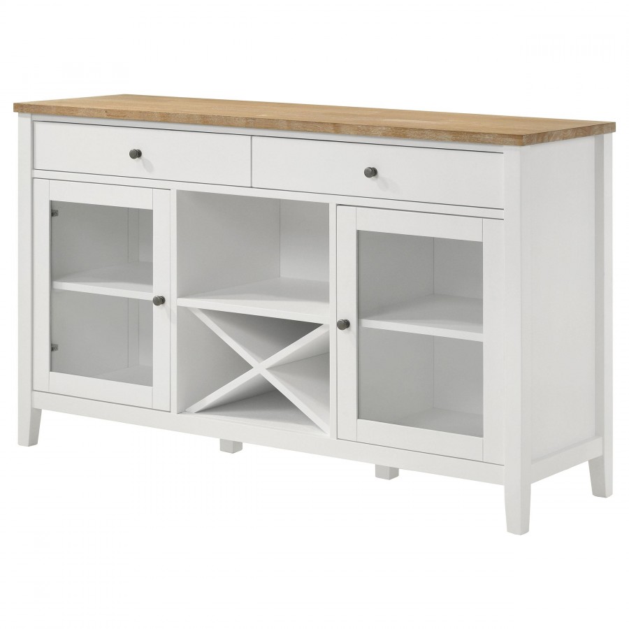 Wire brushing adds the perfect hint of rustic distressing to the table top featured on a modern farmhouse sideboard. Its two-tone look adds charm in a kitchen or dining room, with a natural wood top and crisp white base that adds contrast while maintaining a neutral color palette. Two drawers are ideal for utensils and delicate items with felt lining in a light brown hue. Two side cabinets add glass doors for showing off cookbooks, crockery or glassware. In the center, one open shelf and an X-cross bottle rack add a perfect spot for favorite bottles of wine and stylish decor that brings a personal touch.