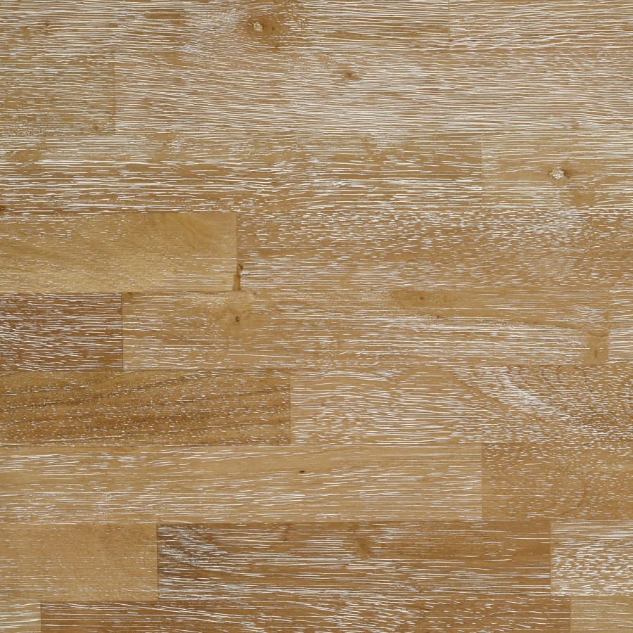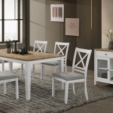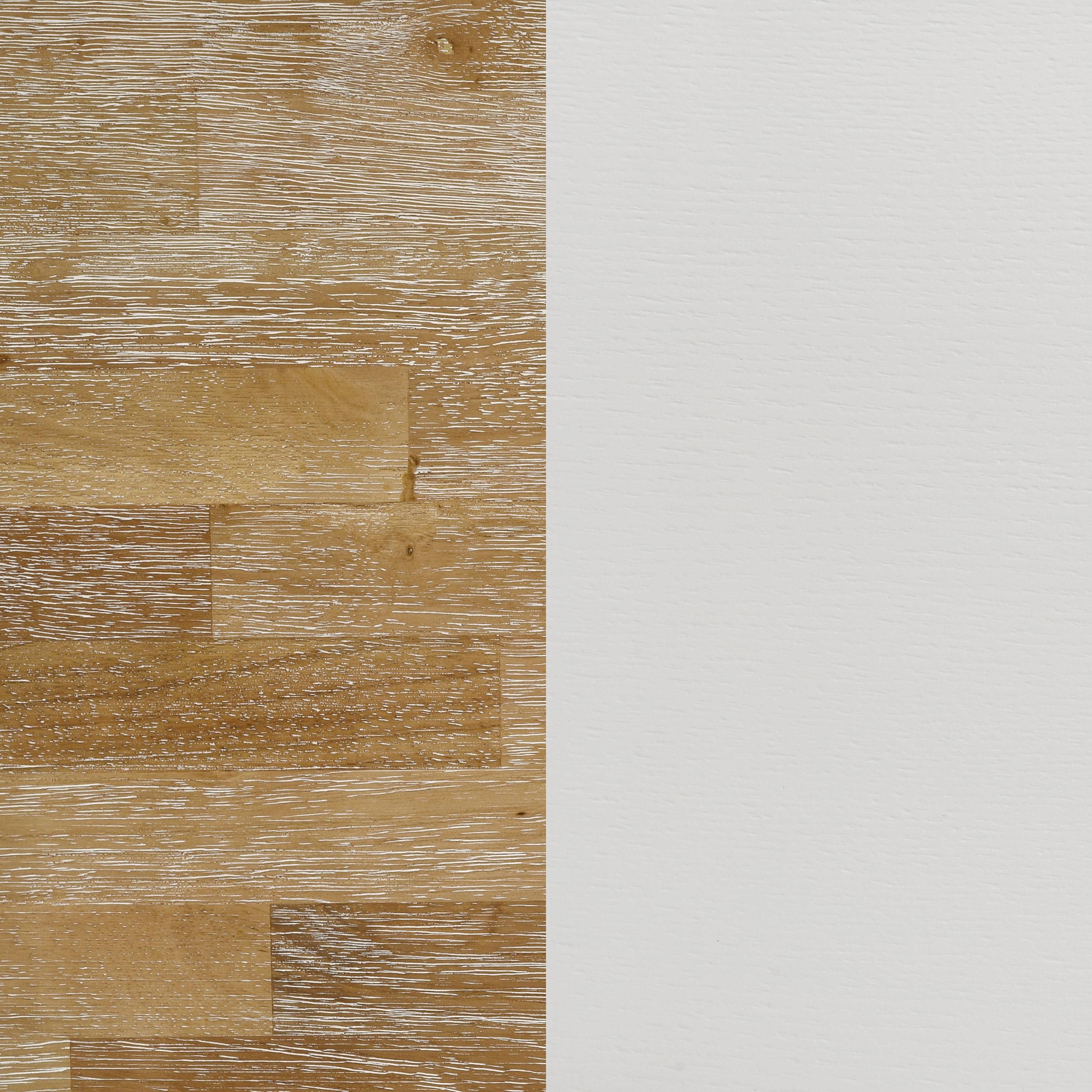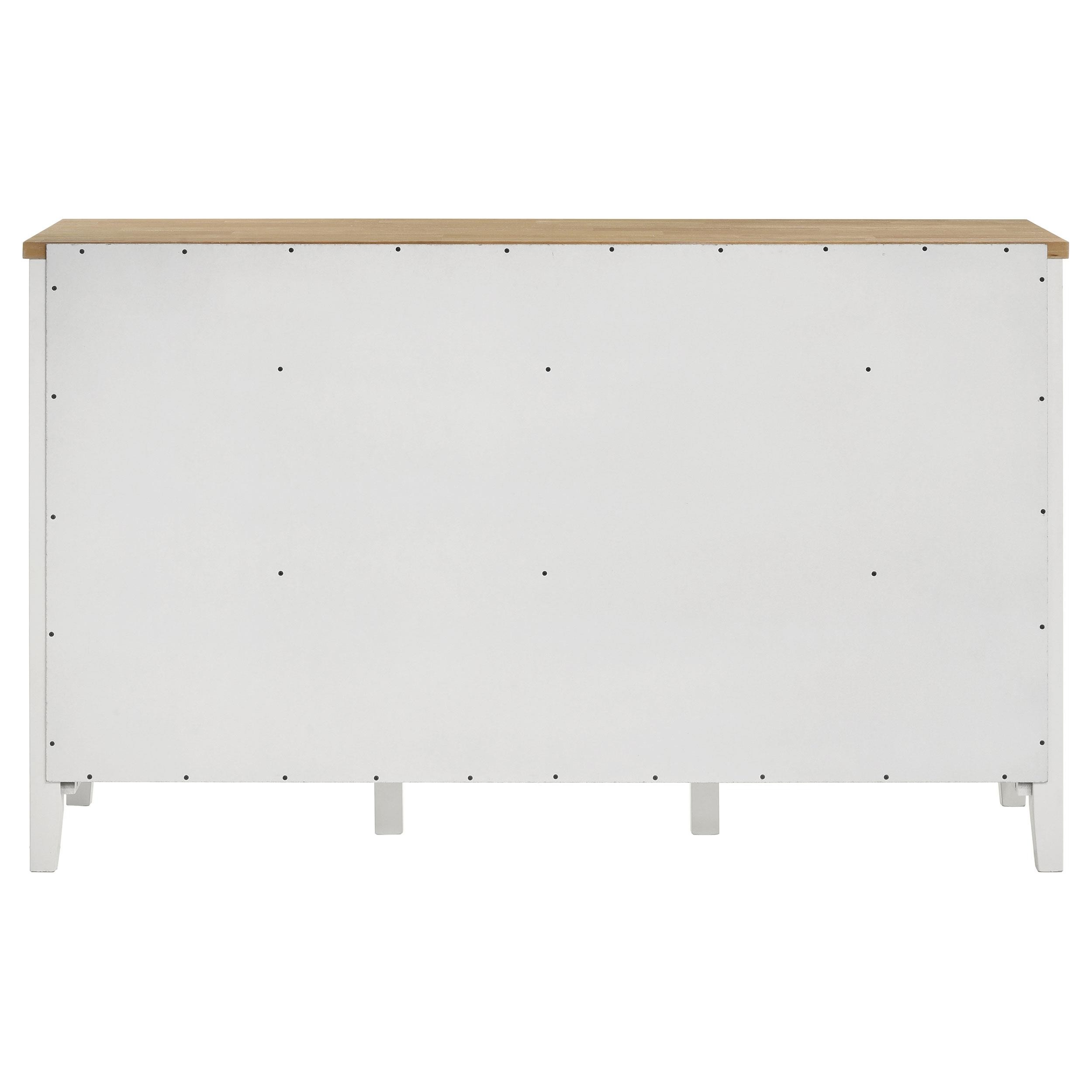 Wire brushing adds the perfect hint of rustic distressing to the table top featured on a modern farmhouse sideboard. Its two-tone look adds charm in a kitchen or dining room, with a natural wood top and crisp white base that adds contrast while maintaining a neutral color palette. Two drawers are ideal for utensils and delicate items with felt lining in a light brown hue. Two side cabinets add glass doors for showing off cookbooks, crockery or glassware. In the center, one open shelf and an X-cross bottle rack add a perfect spot for favorite bottles of wine and stylish decor that brings a personal touch.