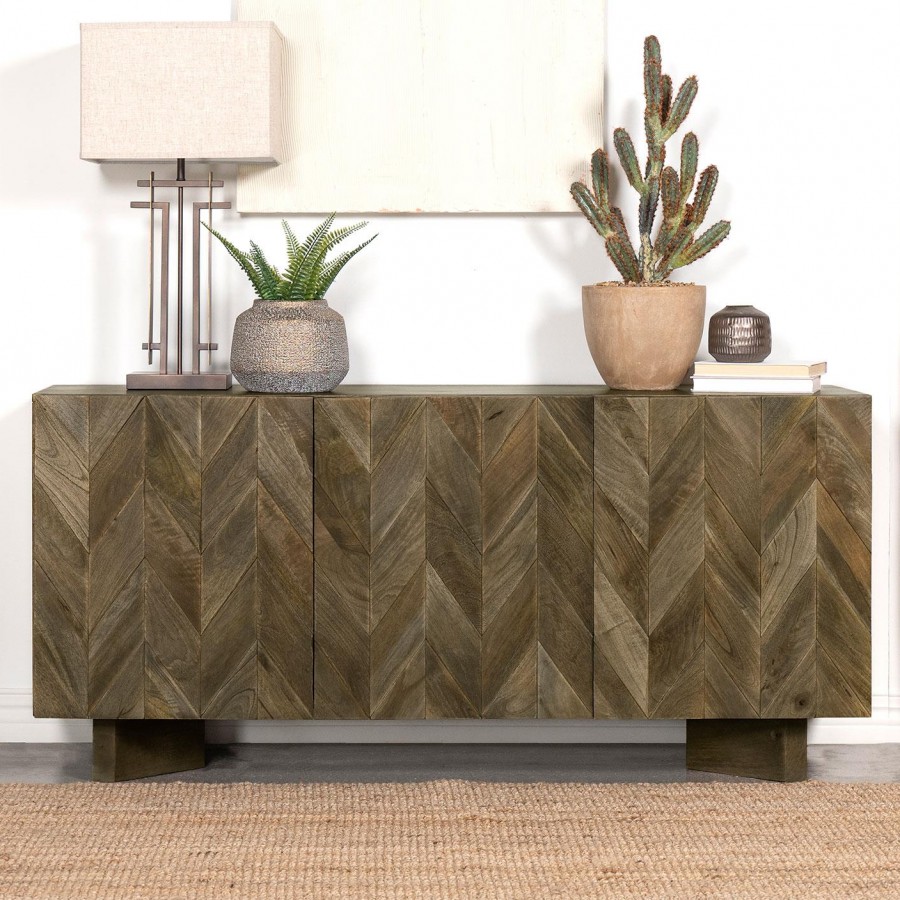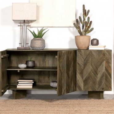 Enhance your dining room with a modern flair using our eco-friendly mango wood dining server. This server showcases a captivating chevron pattern on the door front, adding a touch of character and style to your space. With two adjustable shelves, it provides ample storage for your dining essentials, allowing you to organize and display items with ease.