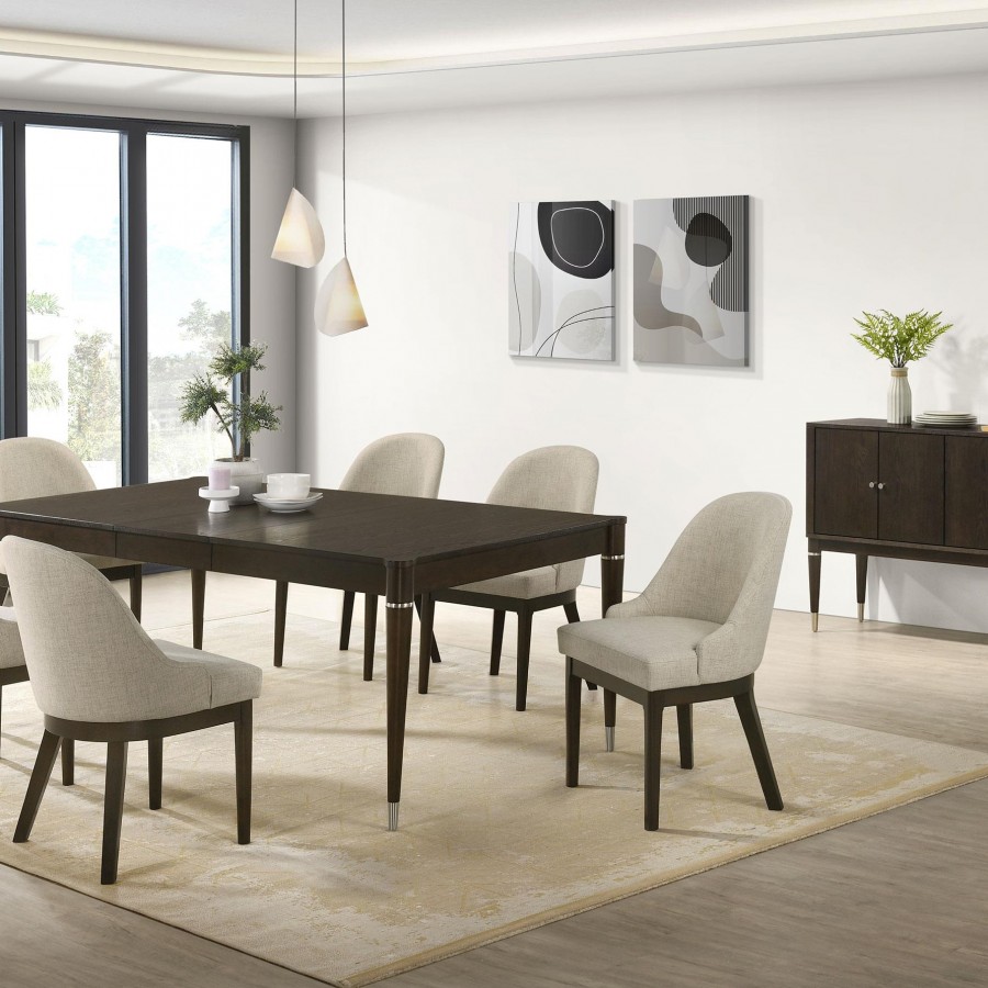 Add both style and functionality to your dining room with this elegant sideboard, finished in a sophisticated ash brown wood tone. The clean-lined design features four cabinet doors that open to reveal spacious shelving, perfect for storing tableware, linens, or other essentials. Crafted from engineered wood, rubberwood, and ash veneer, it ensures long-lasting durability. Sleek metal-capped tapered legs and minimalist hardware accents complete the modern aesthetic, making this sideboard a refined and practical choice for your dining area.