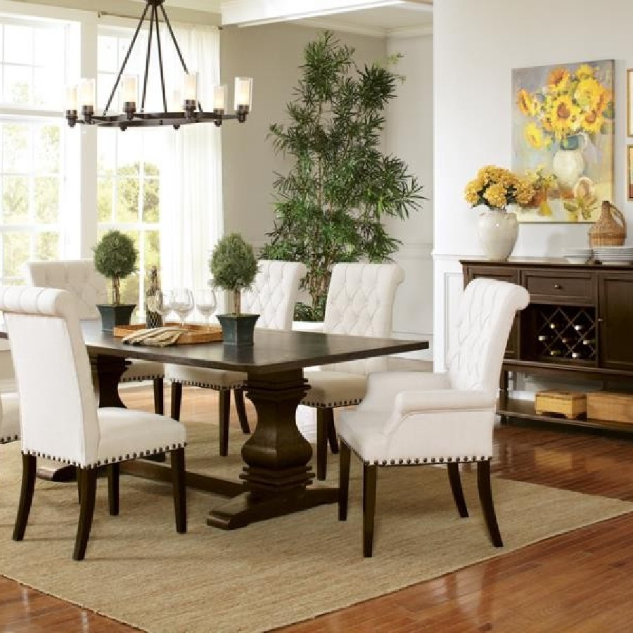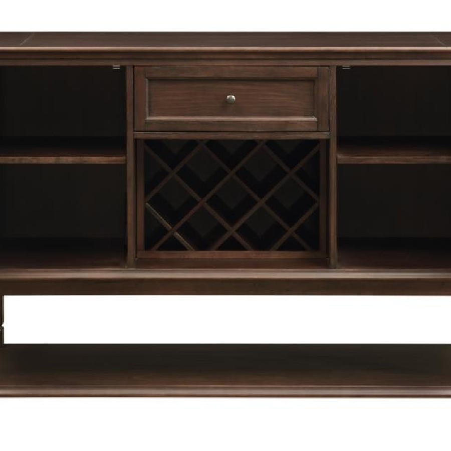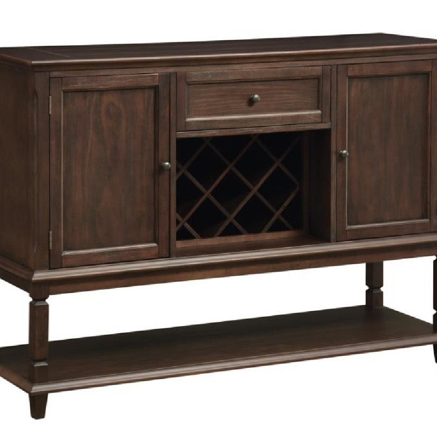 Deep and rich, this transitional classic server is great for a dining room. In a rustic espresso finish, the one-drawer and two door base are raised by tapered legs. The lower storage shelf and built-in wine bottle rack help to keep dinner essentials at hand. Dress up a neutral space with this dark server that is versatile and stylish. The smooth silhouette is given dimension with elevated edges.