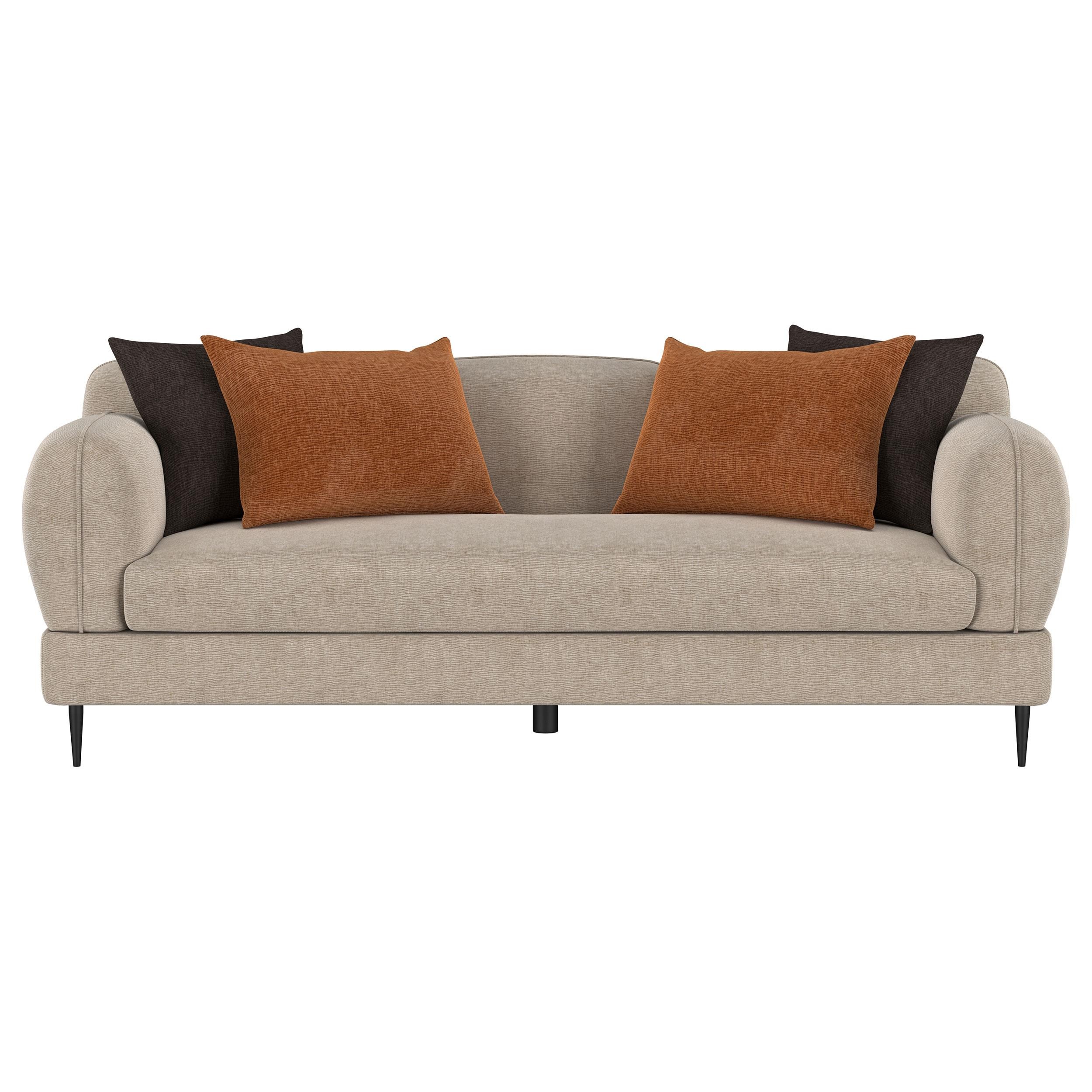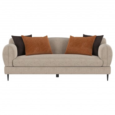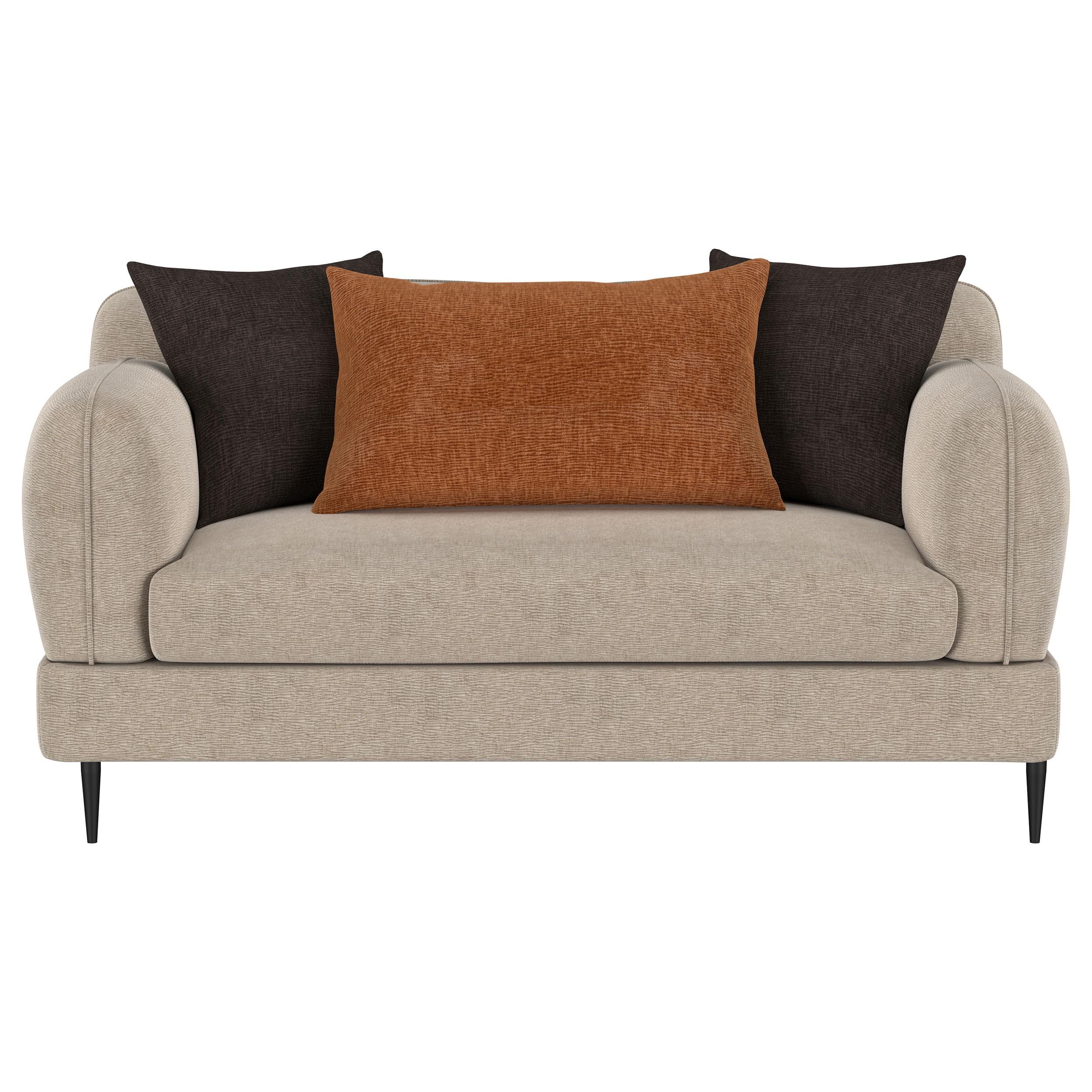 Elevate your living room with this sofa set, featuring a perfectly paired sofa and loveseat in latte chenille upholstery. Rounded, sculpted track arms and matching backs highlight the architectural elegance of both pieces, complemented by seamless waterfall bench seats. Reversible rust and chocolate accent pillows add warmth, while sinuous spring seat decks and full foam cushions provide exceptional comfort. Sleek, tapered metal legs complete the set with a modern, cohesive look.