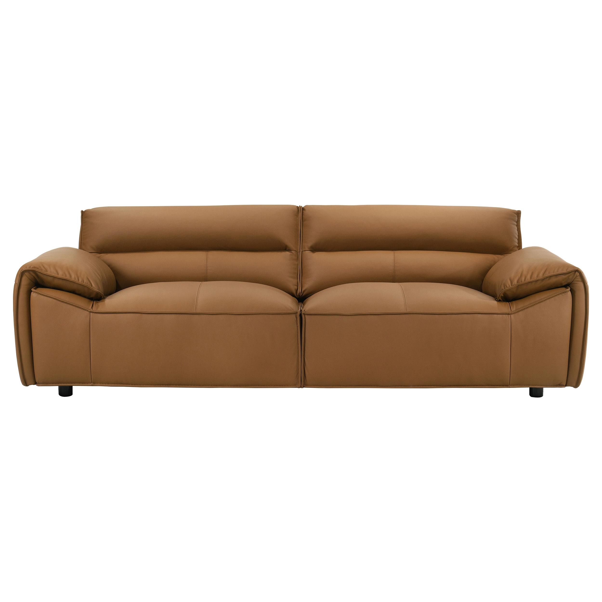 Refined and sculptural, this leather sofa set blends modern minimalism with deep, enveloping comfort. Upholstered in 100% genuine top grain leather, each piece features wide, gently sloped arms and a low-profile frame that grounds the room with effortless presence. Deep seat cushions are filled with high-density full foam and supported by sinuous springs, creating a balanced feel that’s both structured and soft. Tailored yet inviting, this two-piece set is crafted to elevate comfort with enduring sophistication.