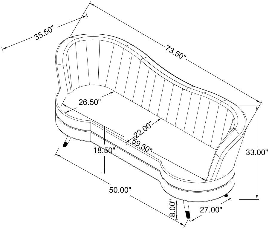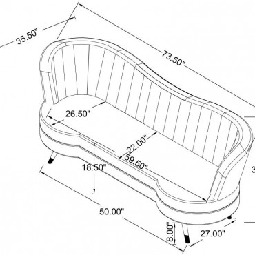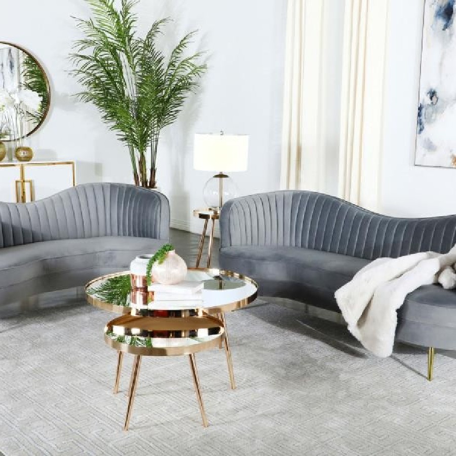 Fashionable matching pieces inspired by artistic mid-century design add a romantic allure to any space when this two-piece sofa set becomes a focal point. Create an artful look with this set featuring decadent gray velvet upholstery and gleaming gold finish stainless steel tapered legs. The dimensional factor of vertical channeling presents an interesting visual to each piece’s interior back, as kidney silhouetting highlights the iconic look of parlor inspiration from a retro era. This set is fully encased in solid wood and offers sinuous spring durability for seating comfort. Set includes one sofa and one loveseat.