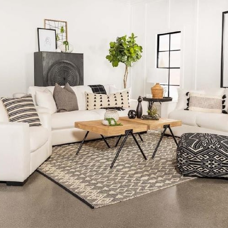 Elevate your transitional living room with this contemporary upholstered seating set, featuring a white trillium polyester blend fabric that covers elegant sloped track armrests as well as reversible box seat and back cushions with top stitching details. Block style legs in a handsome, bold cappuccino finish lend a striking contrast to the clean white upholstery. Matching accent pillows offer extra comfort and unify the seating pieces together.
