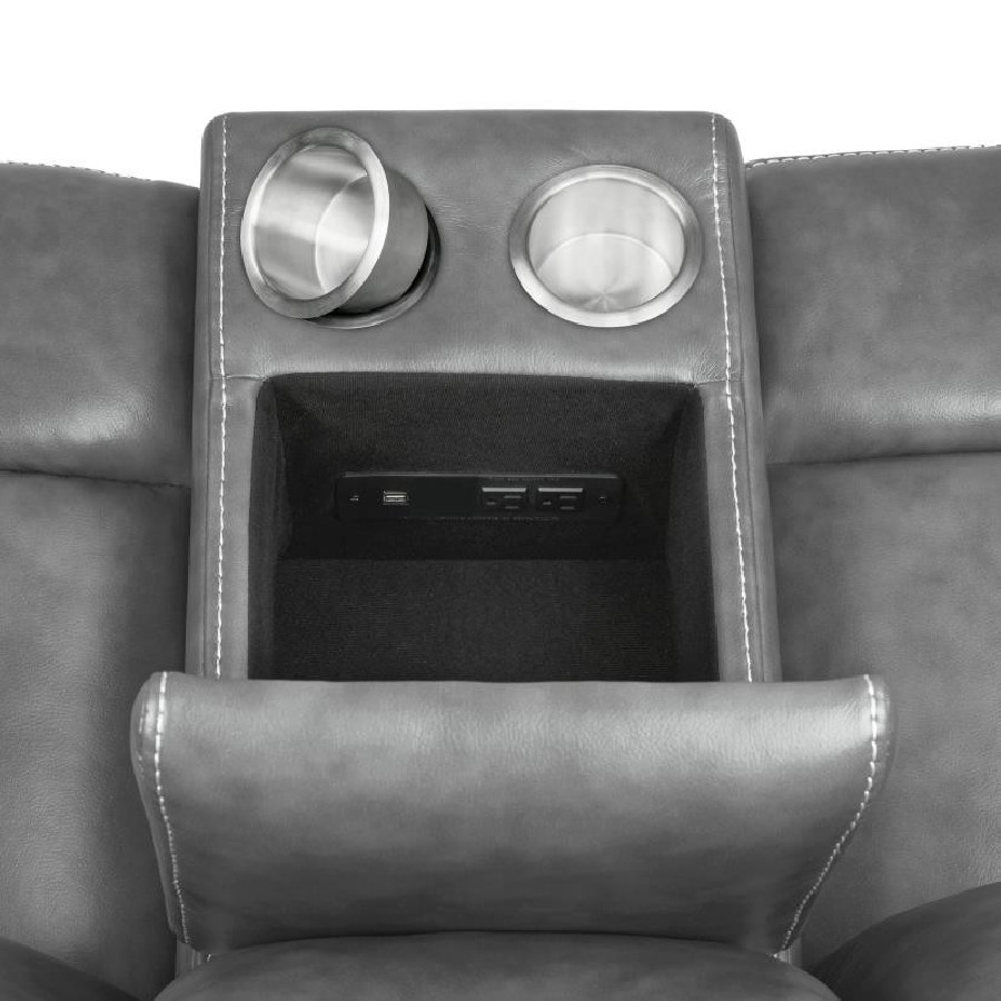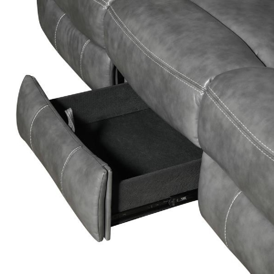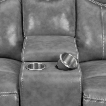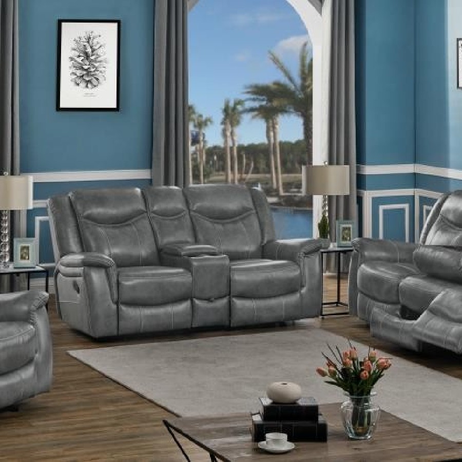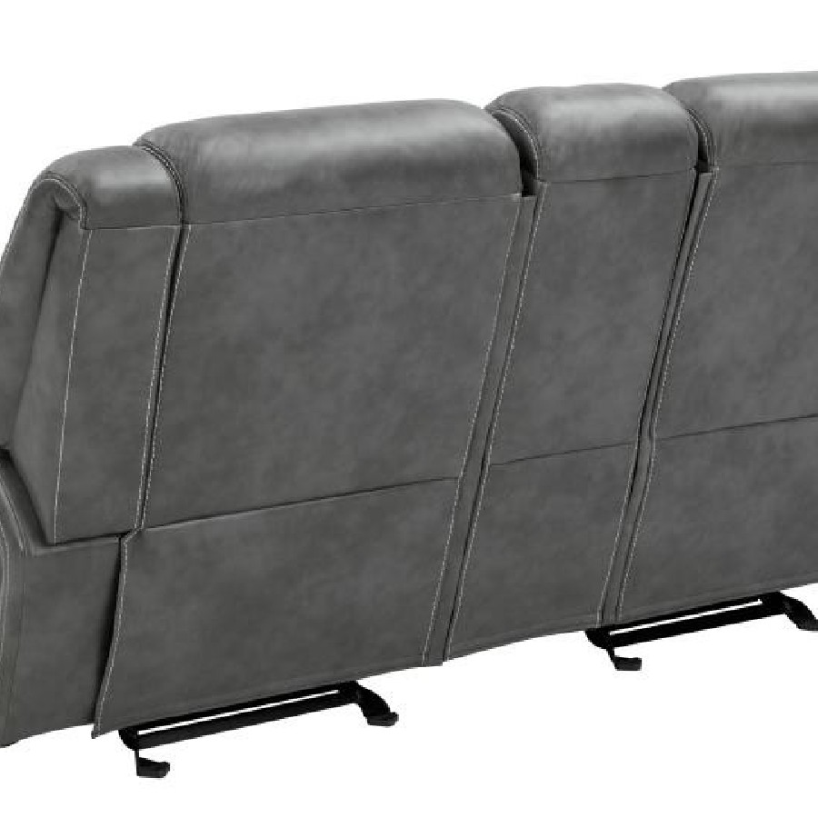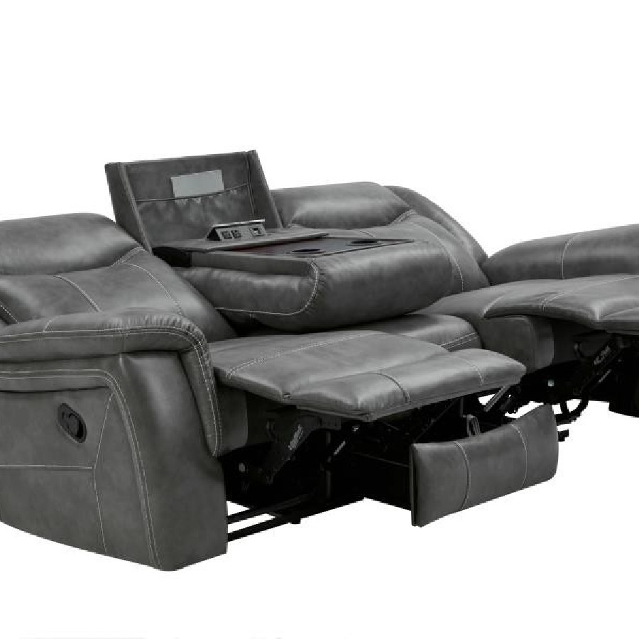 Experience the perfect blend of comfort and functionality with this reclining sofa set, upholstered in smooth grey faux leather for a contemporary appeal. Designed for relaxation, each piece features plush cushioning, padded headrests, and supportive armrests. The collection includes thoughtful upgrades like drop-down tables with cup holders, power outlets, hidden storage, and cool gel memory foam seating. Built with durable metal and plywood framing, this set redefines everyday comfort in modern living spaces.