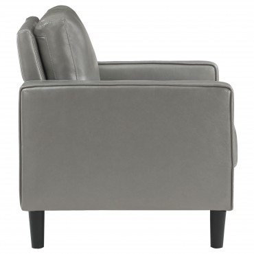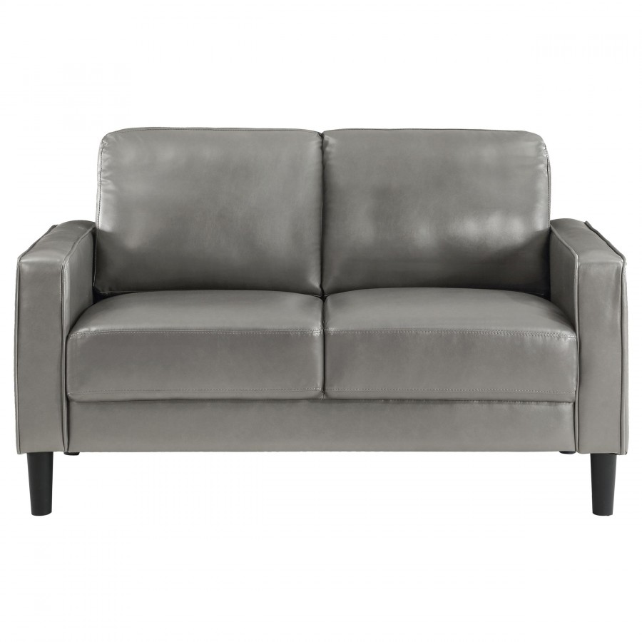 Take a no-fuss approach to your living room decor with the coordinated sophistication of a modern three-piece sofa set that includes a sofa, loveseat, and armchair. Each piece is defined with a structured silhouette and square track arms. Its simple, refined look includes smooth faux leather upholstery, offering a pleasing seating experience with plush cushions. Each piece sits on straight, tapering legs that create a touch of height for an airy, modern look and feel in your living room. Seating is supported with sinuous springs and webbed decking add support behind attached back cushions for optimal comfort.