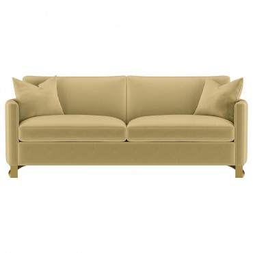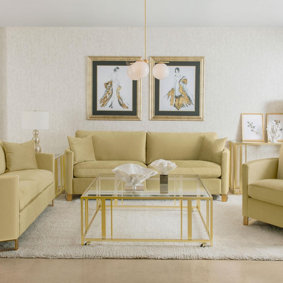 Indulge in opulent comfort with this textured velvet living room sofa collection. Reversible feather blend seat and back cushions, curved arms, and gold stainless steel legs. Smooth upholstery and lustrous details blend simplicity with timeless splendor, creating a refined focal point that enhances both modern and classic interiors with style and relaxation.