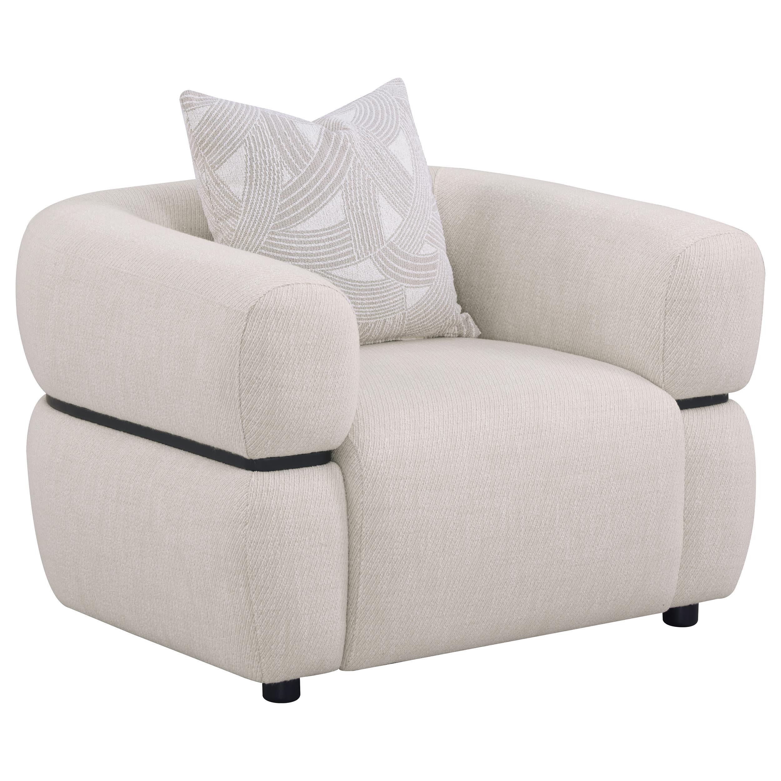 Boldly sculpted and beautifully tailored, this modern sofa set showcases a seamless blend of dramatic curves and soft textures. Each piece features wide waterfall bench seats, structured with pocket coil support for lasting comfort. Wrapped in textured beige upholstery, the forms are accentuated by a solid wood waistband detail that encircles the exterior in refined elegance. Designed for statement living rooms, this set balances artful design with plush, lounge-ready seating.