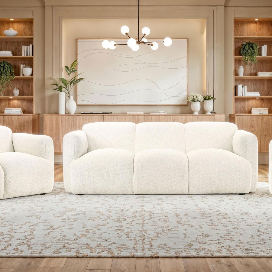 This sculptural sofa set blends soft curves with modern simplicity for a cozy, elevated lounge experience. Each piece is wrapped in richly textured fabric and designed with a low-profile frame, rounded edges, and wide track arms that invite you to unwind. High-quality foam and pocket coil seating ensure supportive comfort that lasts. With its seamless silhouette and tactile finish, this sofa set offers minimalist warmth and relaxed sophistication for any contemporary living space.