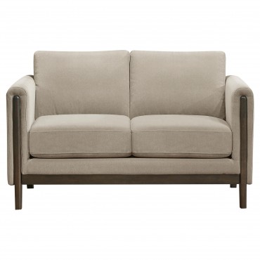 Rooted in clean architectural lines, this upholstered sofa set blends modern structure with plush comfort. Each piece is framed in engineered wood with a warm coffee finish and features recessed panel arms that lend sculptural definition. Upholstered in soft taupe polyester, the seat and back cushions are fully reversible, offering extended usability and lasting support. Designed to bring balanced form and function to contemporary living spaces.