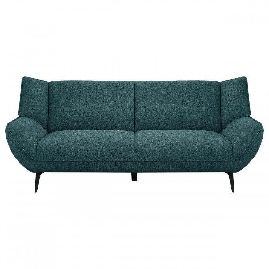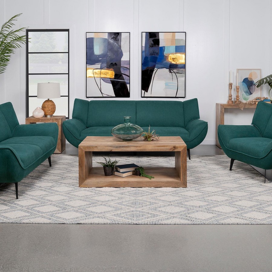 Bring the best of mid-century modern style to your casual space with this sofa set that inspires. This comfy and stylish teal blue set is a great choice for outfitting a living room or family room. Gorgeous fabric upholstery opens up possibilities for a lush palette choice. Flared arms and wing backs attach to non-removable seat and back cushions. Tapered black metal legs coordinate with the beautiful teal blue upholstery.
