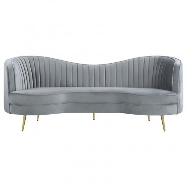 Inspired by a glam version of mid-century artistry, this three-piece sofa set offers all that’s needed to begin a romantic living space motif. Give a living room or family room its best design life with this set built with frames fully encased in solid wood and covered in decadent gray velvet. Vertical channeling on back interiors highlights the iconic kidney shape of its sofa and loveseat and add dimensionality to an extra comfy accent chair. Set atop slender, tapered legs fashioned of gold finish stainless steel, each piece reflects the parlor look of upscale retro furnishings. Set includes one sofa, one loveseat, and one chair.