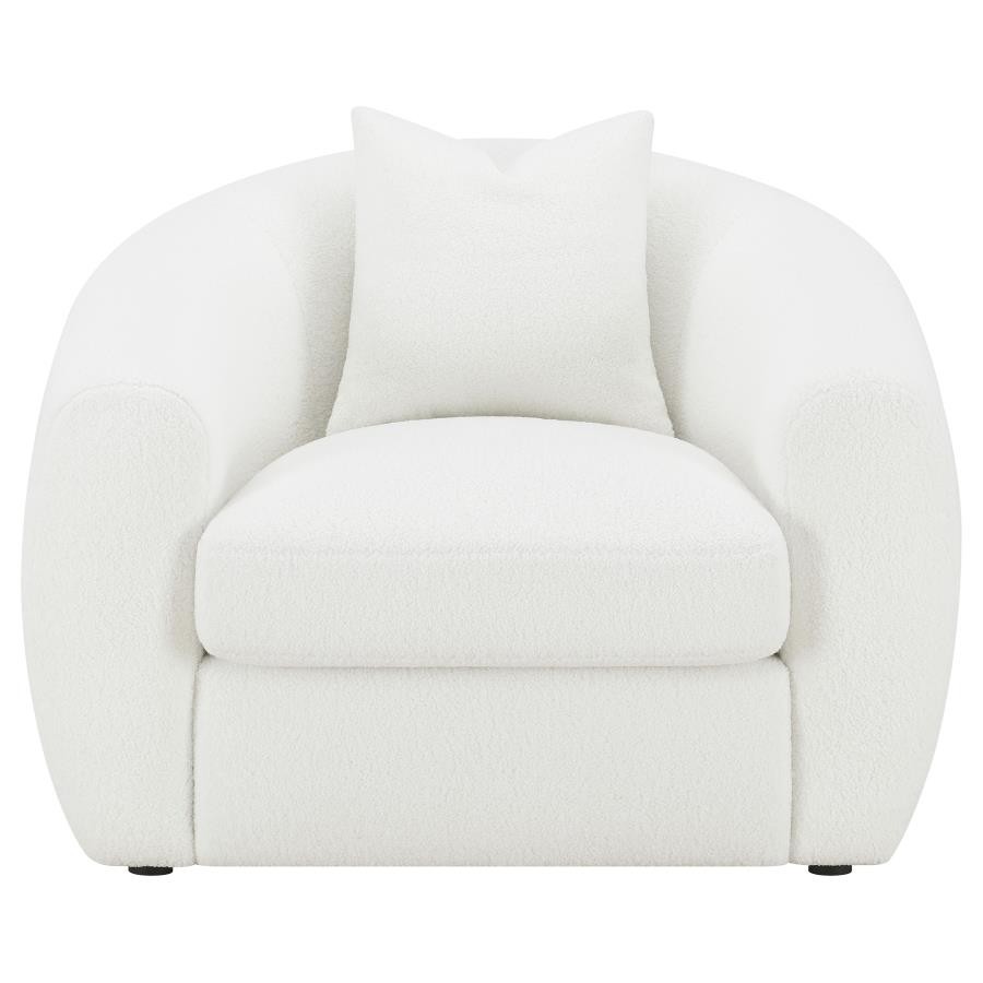 Softly sculpted and elegantly tailored, this modern sofa set exudes refined comfort through its plush faux sheepskin boucle upholstery. The gracefully curved silhouettes and sloped armrests bring an airy, cloud-like form that enhances any contemporary space. Plush cushions offer superior comfort and support, while faux down accent pillows provide inviting texture. Finished with black legs for a sleek contrast, this collection blends warmth, sophistication, and timeless design for the perfect modern retreat.