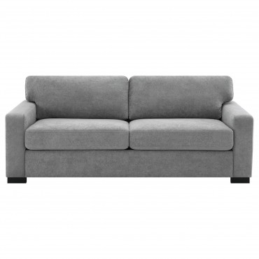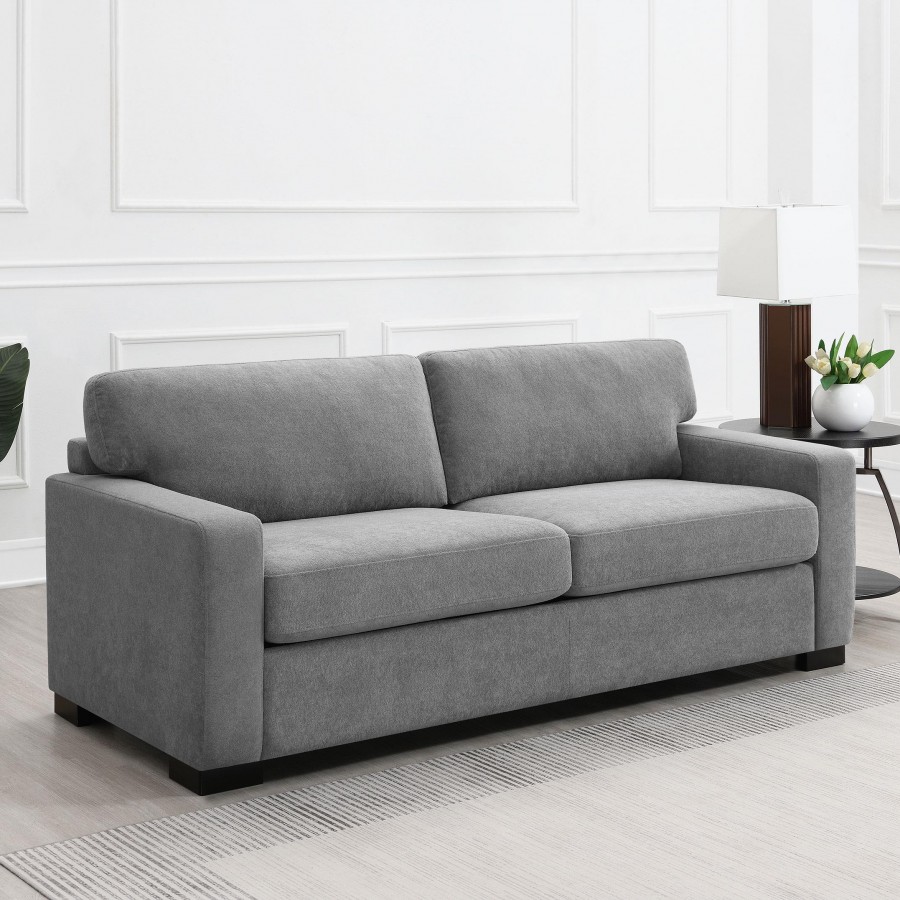 Center your stylish living space on a contemporary sleeper sofa. In light grey upholstery with a soft look and feel, it creates an inviting focal point while offering both daily seating and overnight accommodation. It features plush seating with spring supports and foam cushions for excellent comfort. The sofa features track arms, with wide block feet in a black finish that adds contrast and depth. Choose this sleeper sofa to bring style and flexibility to your home.