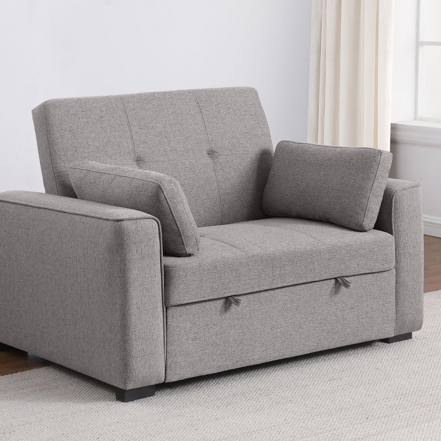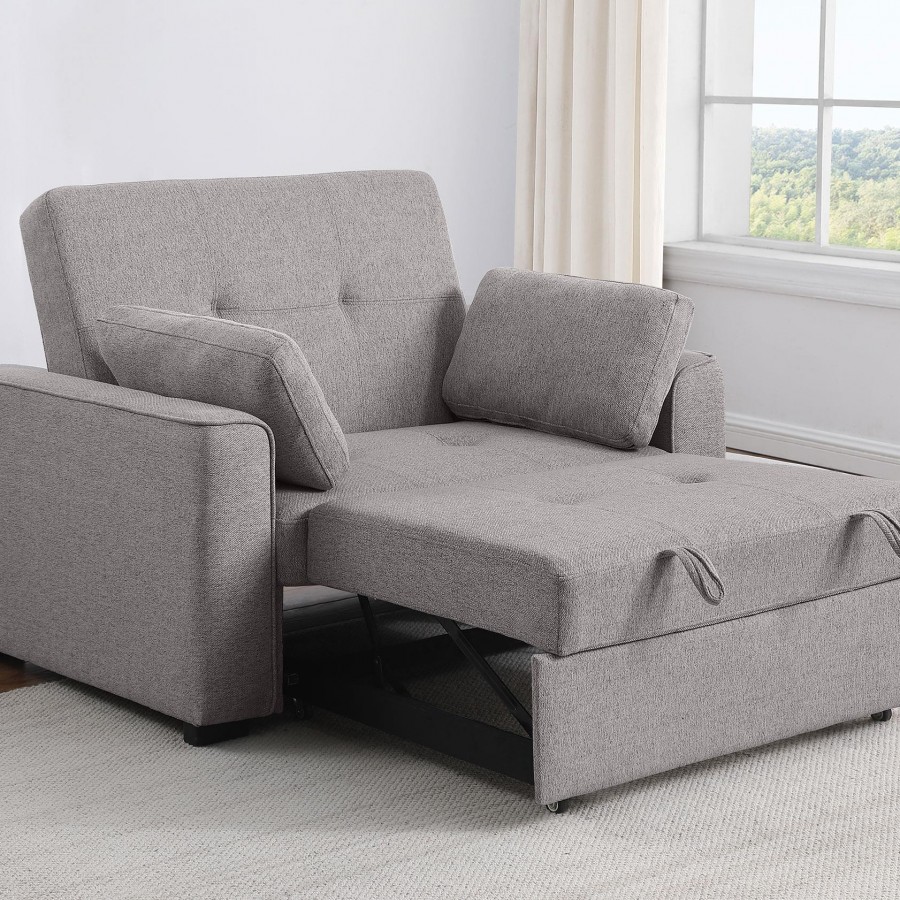 Add flexibility to your home office or living room with a modern sofa bed that doubles as a comfortable armchair. Perfect for guests or lounging, the armchair converts to a single bed, for a comfortable night's sleep. It's neutral upholstery suits in a variety of spaces, while biscuit tufting and piped trim creates a tailored look and feel. The sleeper includes two accent pillows that are ideal for relaxation no matter its configuration. Track arms adds structure and definition to clean-lined design that blends anywhere.