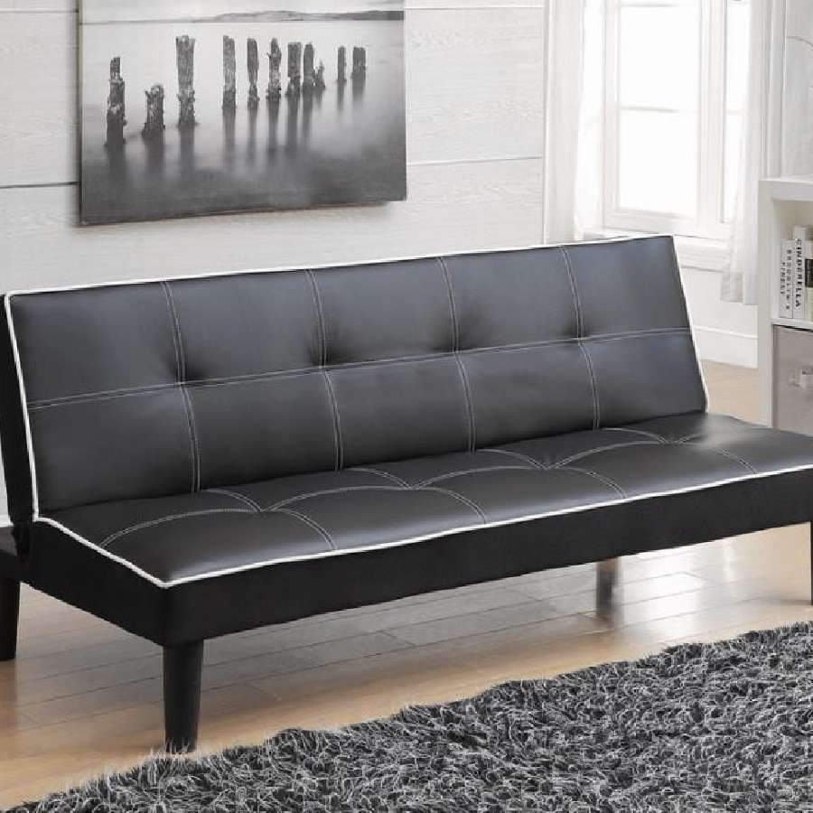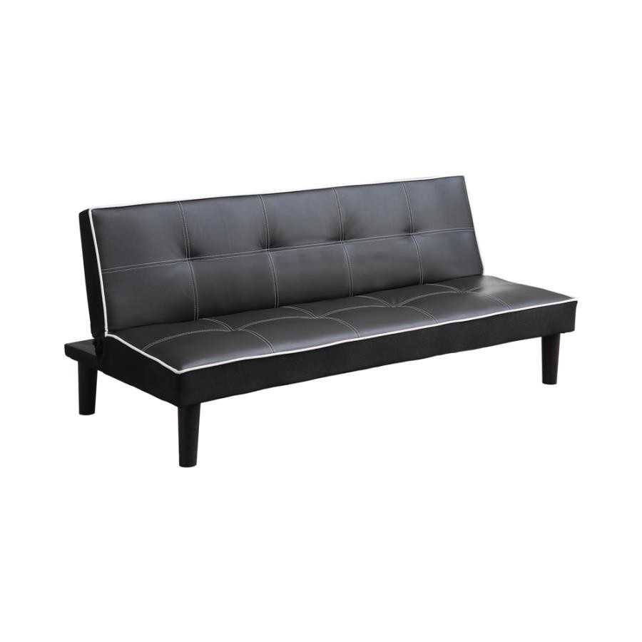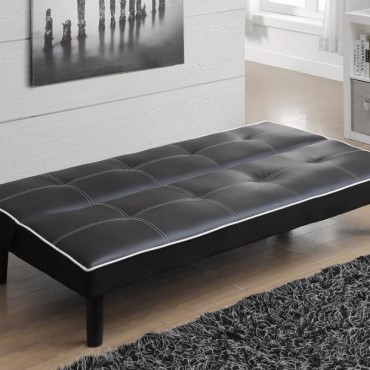 Add sleek and versatile structure to any living room with this black sofa bed. Featuring a modern silhouette, the cushions rest on top of a durable kiln dried hardwood frame. The dark leatherette upholstery is given contrast with a lightly hued piping and square-shaped tufting. Designed for comfort, this sofa bed is complete with sinuous spring decking and high-density foam. This sophisticated piece is also available in grey with black piping and brown with tan piping.