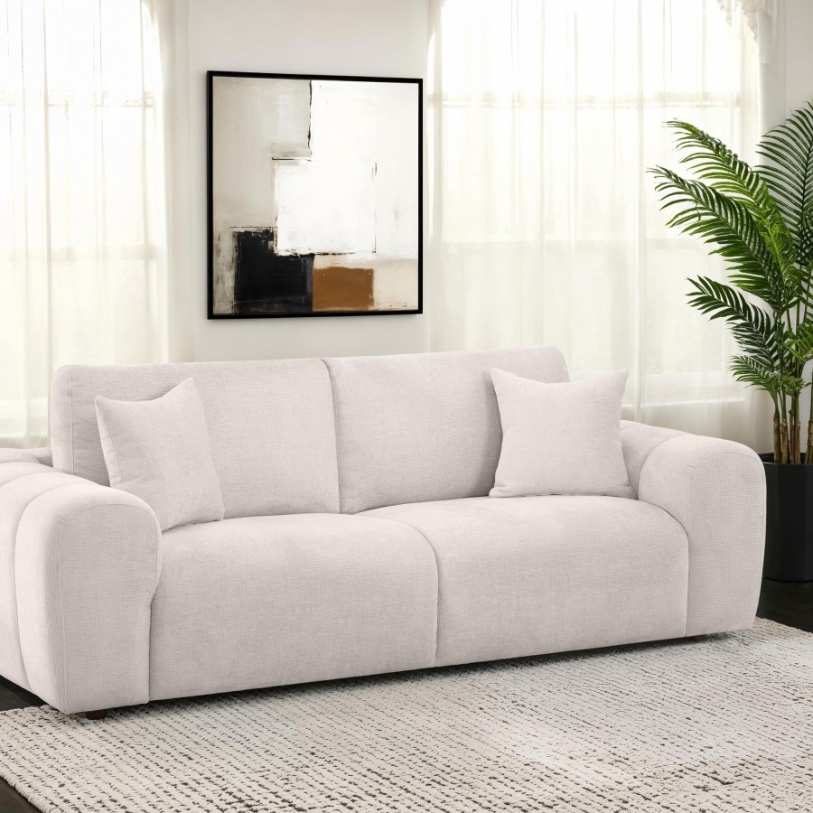 A bold statement in plush comfort, this sculptural sofa blends contemporary curves with relaxed charm. Chunky arms and a low profile enhance its casual elegance, while deep foam cushions and accent pillows offer cozy support. Wrapped in soft chenille upholstery over a sturdy blend of rubberwood and engineered wood, this lounge-ready piece is designed for everyday comfort. Ideal for living rooms, lounges, or open-concept interiors.
