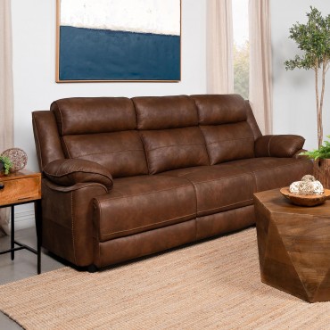 A chic mottled effect brings authenticity to the lush faux leather upholstery of a transitional sofa. Seating three, it features a dark brown color that's deep and rich, a perfect complement in a stylish but relaxed living room. The sofa boasts exceptional comfort and support, complete with pocket coil seating and full foam cushions. Pillowtop arms complement plush cushions, creating the perfect spot for lounging. Its relaxed stance makes this sofa the perfect choice for a family room or den, creating a welcoming aura that brims with comfort.