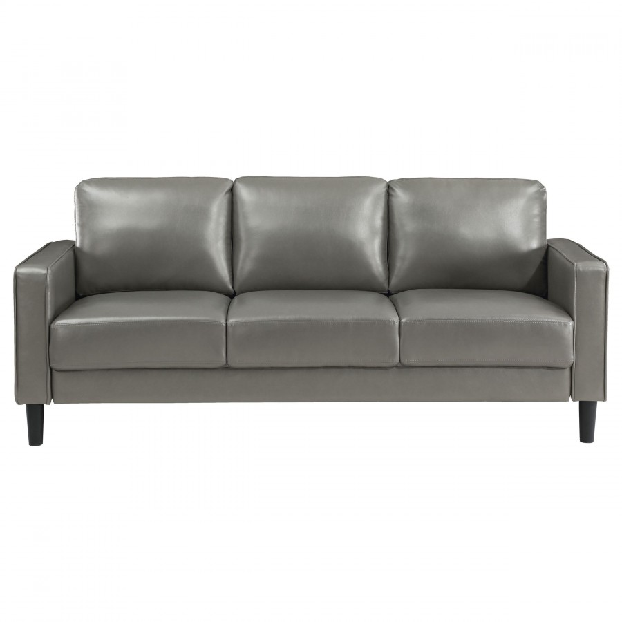 Establish the foundation of a stylish living room with a modern sofa. Smooth faux leather creates a sleek, neutral look that brims with sophistication. Track arms create a structured silhouette, offering tailored flair with an understated ambiance. Straight, tapered legs support the sofa and ensure stability. Supportive cushions create an inviting look and feel, with sinuous spring decking under seat cushions and webbing across the back for optimal comfort.