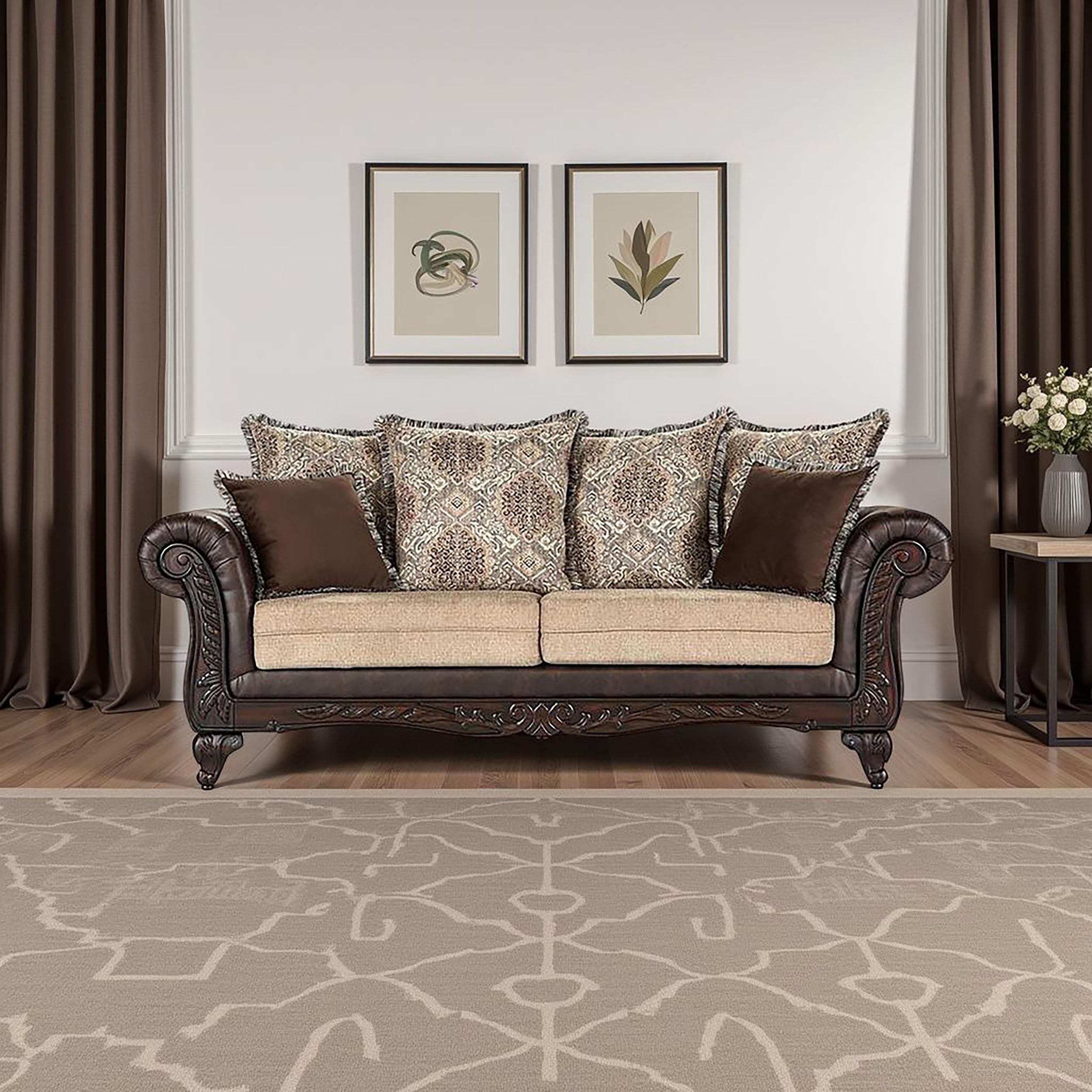 Plush indulgence meets traditional design in a compelling upholstered sofa. Its regal stance showcases dramatic rolled arms, complete with carved enhancements across their fronts and the sofa's apron. The carvings continue on curvy feet, while dark brown faux leather is a stylish accent. A trio of fabrics decorates the sofa, offering light brown on seats, a classic brown pattern and fringe trim on back pillows, and charming brown accent pillows. Seats are comfortable and supportive, featuring sinuous springs and excellent cushioning that ensures this sofa is the perfect place for relaxation.