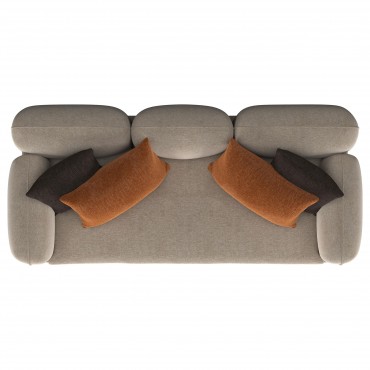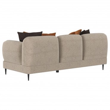 Experience a sophisticated blend of architectural design and plush comfort with this sofa. The latte chenille upholstery provides a subtle textured appeal, complemented by sculpted round arms and a matching back that mirror each other’s clean lines. Its waterfall bench seat offers a seamless look, supported by a sinuous spring seat deck and full foam cushioning for superior comfort. Reversible rust and chocolate accent pillows add warmth, while sleek, tapered metal legs complete its contemporary charm.