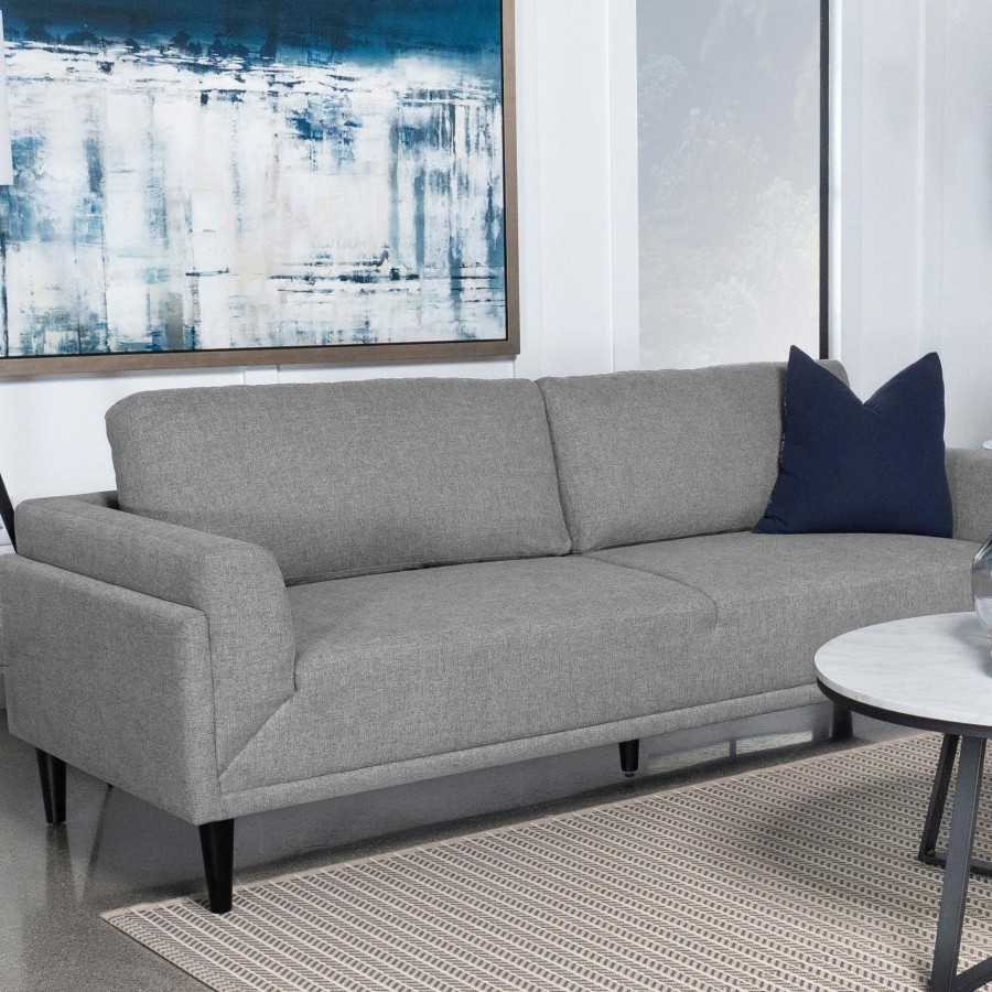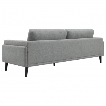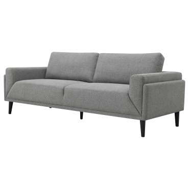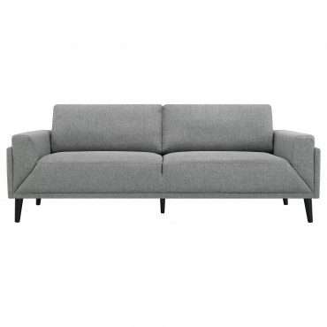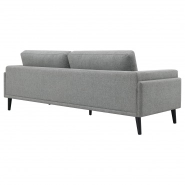 Unveiling our modern sofa, where innovation meets elegance in a frame within a frame design. Adorned in a chic fabric, its streamlined silhouette is highlighted by meticulous topstitch details and track arms complemented by mitered front accents. Prioritizing comfort, the sofa comes with reversible back cushions and pocket coil seat construction, ensuring a snug and supportive seating experience. Anchored by tall, black cylinder-shaped wooden legs, this sofa stands as a blend of style and function, ready to be the centerpiece in any contemporary living space.