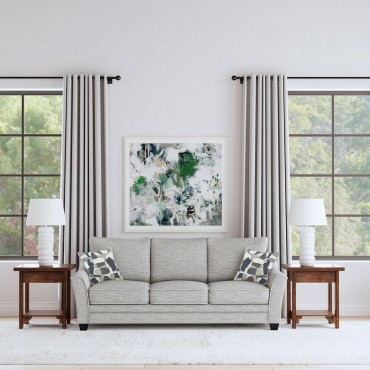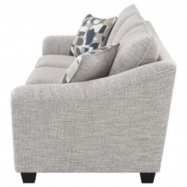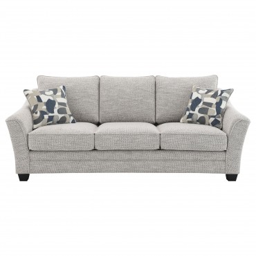Create comfortable seating while embracing style with this well-tailored sofa collection. Upholstered in a textured, multidimensional gray boucle fabric, it's perfect for camouflaging wear and offers impressive texture and dimension in your living room. The sofa features sloped arms, boxed seat cushions, and tall back pillows, all finished with welt trim, offering wonderful comfort and support for seating and lounging. A classic silhouette is updated with gently sloping, flared armrests, creating a fresh, inviting profile. The design is completed with tall, tapering block legs in a dark finish, providing a sturdy foundation and completing the look.