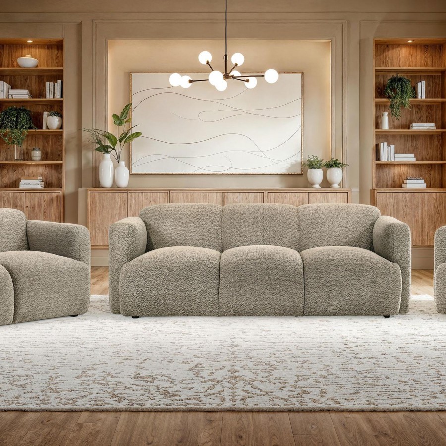 This sculptural sofa blends soft form with enduring comfort for a modern, relaxed atmosphere. Upholstered in a richly textured fabric with a cozy hand, its rounded profile flows seamlessly from the low back to wide, curved track arms. Built with high-quality foam and supportive pocket coil seating, it invites you to sink in and stay awhile. Fully finished and designed for everyday ease, this three-seat sofa anchors the living space with plush, minimalist style.