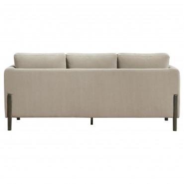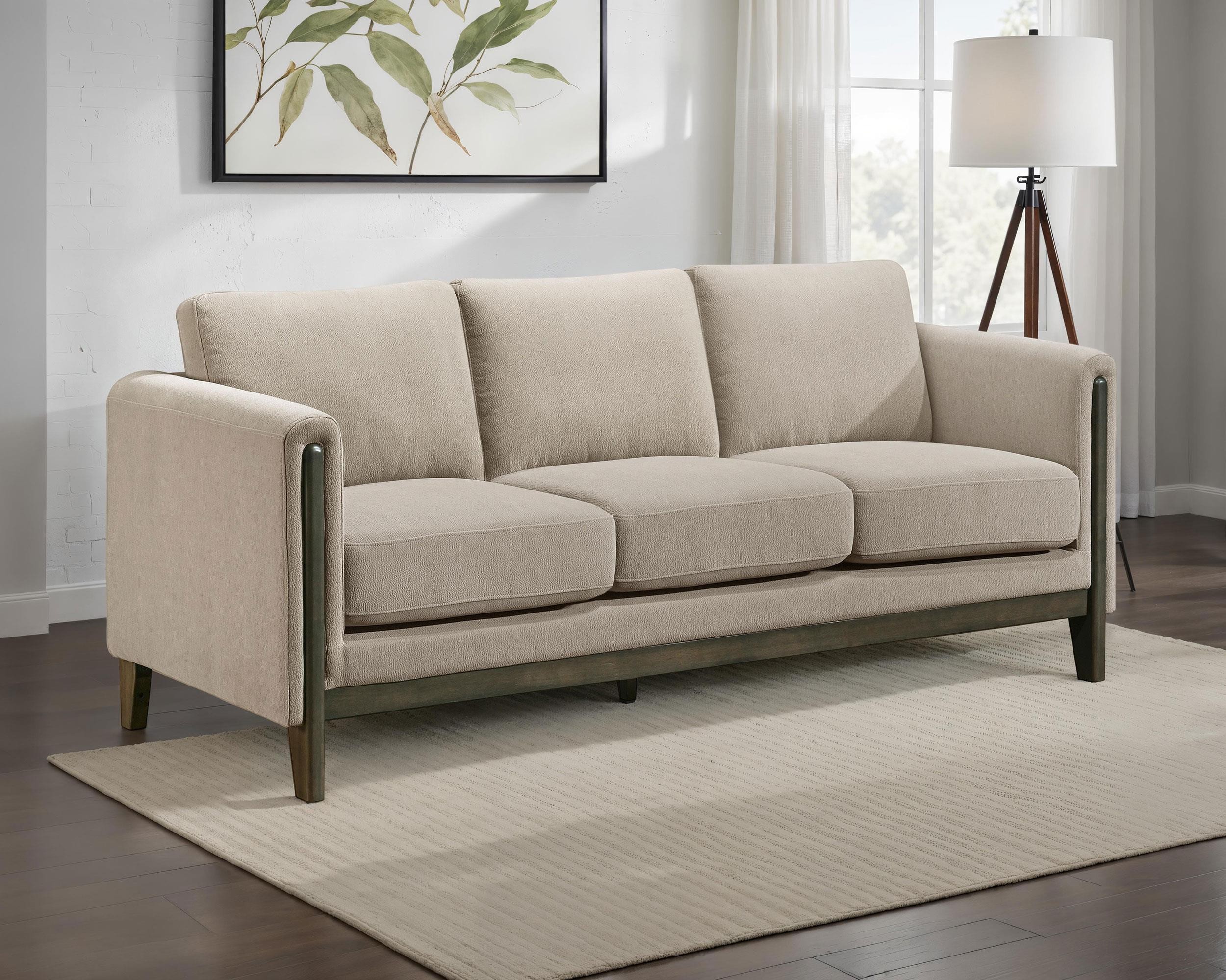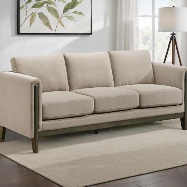 Rooted in clean lines and modern comfort, this upholstered sofa offers a grounded yet welcoming presence. Its engineered wood frame in a rich coffee finish defines the silhouette, while recessed panel arms add architectural interest. Upholstered in soft taupe polyester, the sofa features plush, reversible seat and back cushions for extended comfort and longevity. A refined blend of structure and softness for today’s living spaces.
