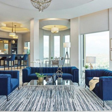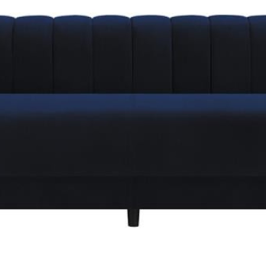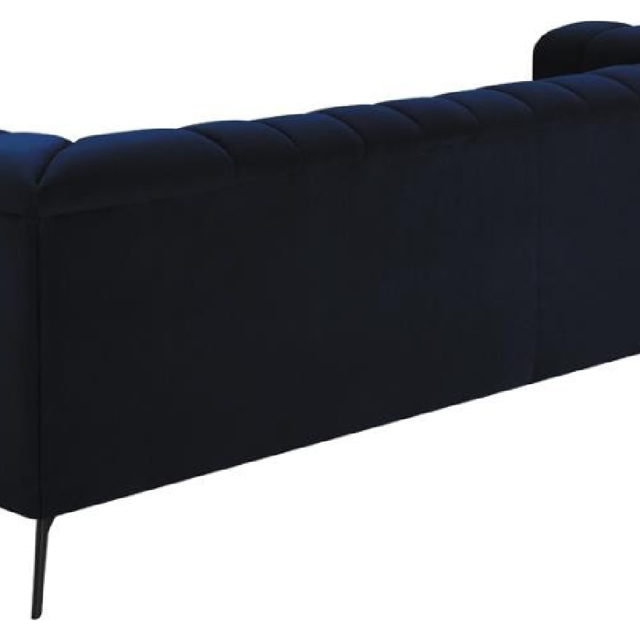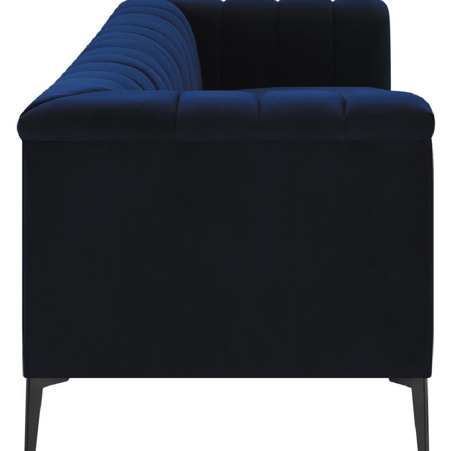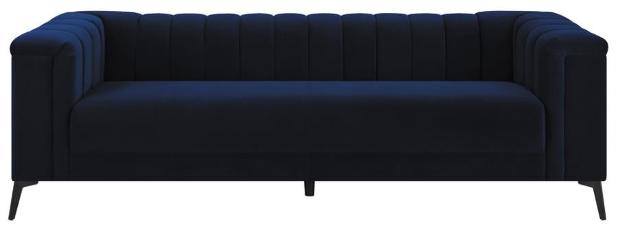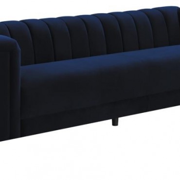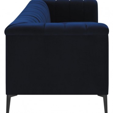 This magnificent transitional sofa will bring a dynamic radiance to your living space. It's upholstered in a stunning navy blue matte velvet fabric that you have to see to believe. Whether you sit or lie down, you'll love the bench-style seat with pocket coil springs for comfort and support. The shelter back and inside arms are crafted with deep vertical channels that are a visual delight. Tapered black metal legs bring the entire design together for a sofa that will transform the vibrancy of your home.