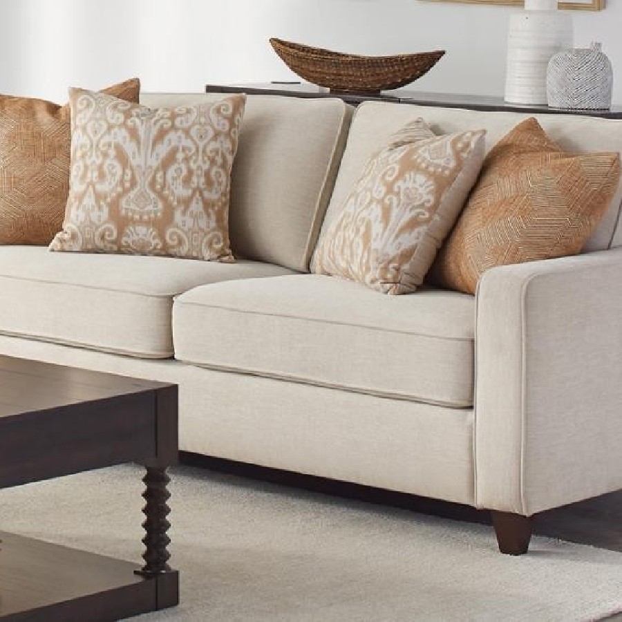 Brighten your living space with this upholstered sofa wrapped in soft beige chenille. Designed for comfort and elegance, it features gently sloped track arms and tall tapered wooden legs that create a refined transitional silhouette. The boxed seat and back cushions include classic welt trim for tailored appeal, while coordinating accent pillows in copper and coral tones bring subtle contrast. Built with a durable wooden frame and foam cushioning, this sofa blends timeless design with everyday comfort.