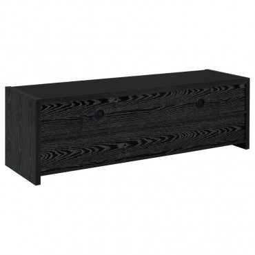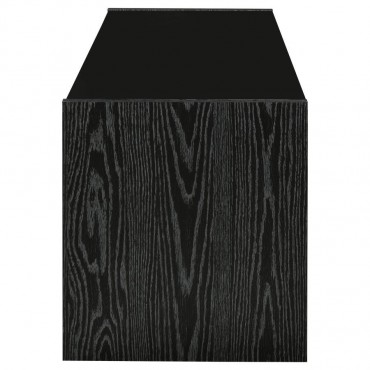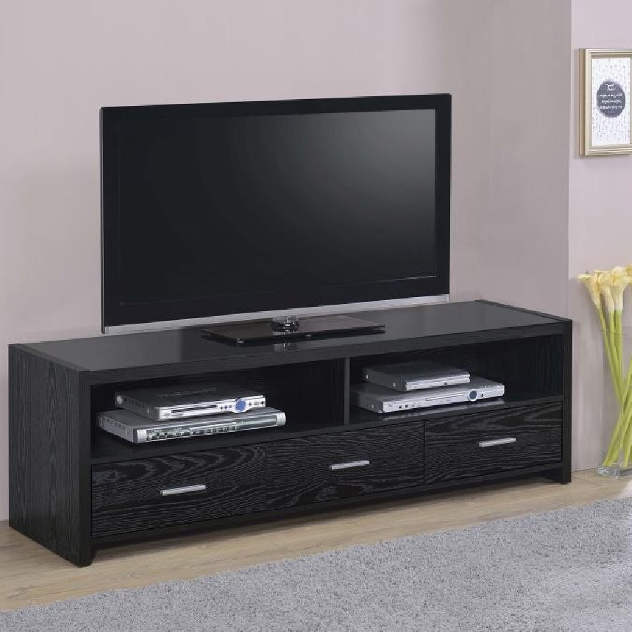 Enhance your modern living space with this 61-inch TV stand in a rich black oak finish. Designed to accommodate TVs up to 70 inches, it features a sleek profile accented by brushed silver hardware for a contemporary contrast. Two open compartments provide easy access for media components, while three spacious drawers store accessories, remotes, and gaming essentials. Crafted from engineered wood with a black tempered glass top, this stylish TV stand blends function and elegance with lasting durability.