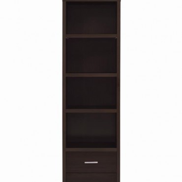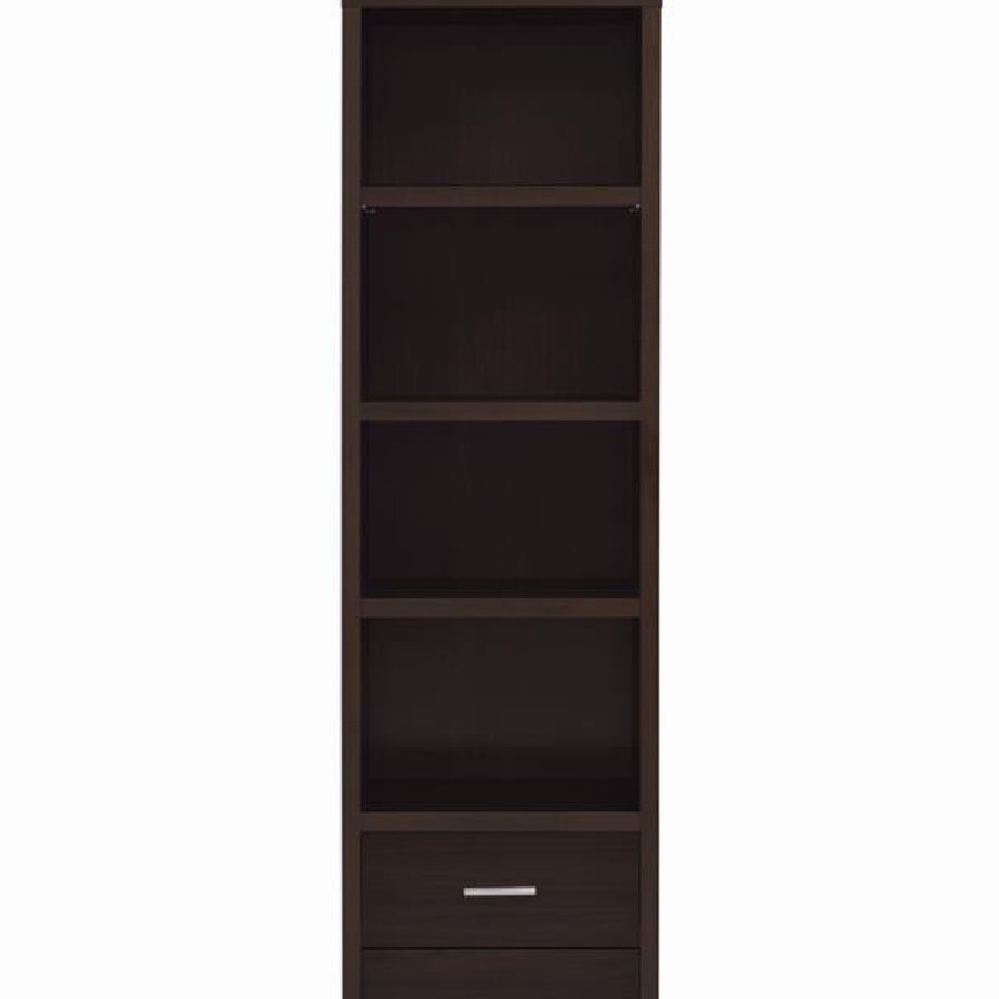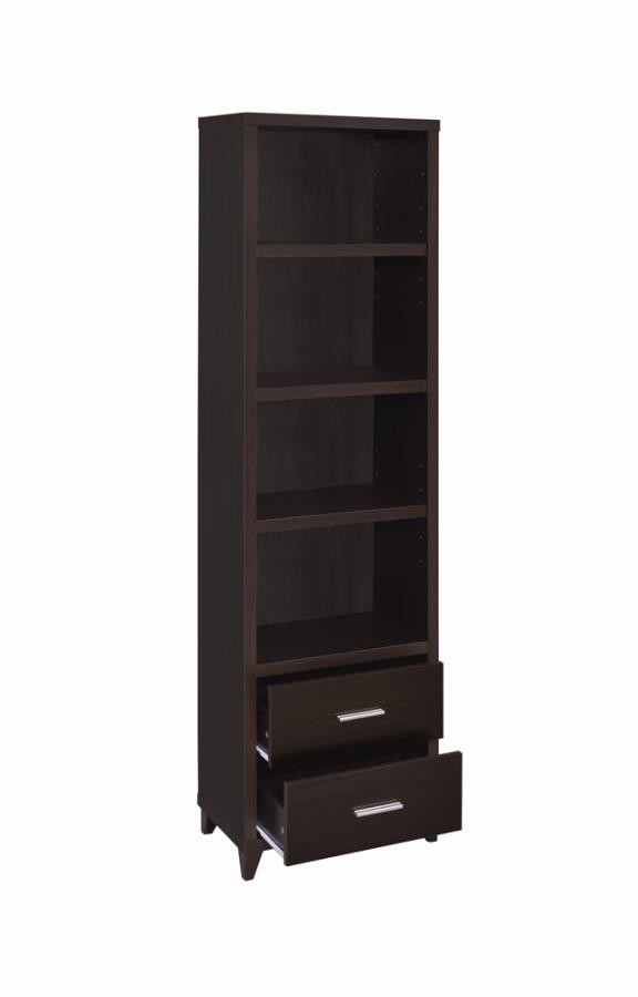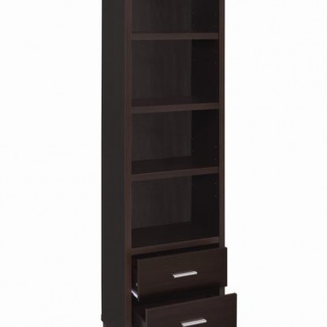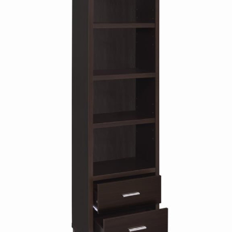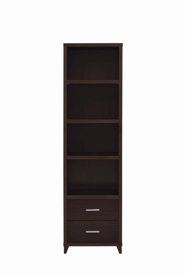 Elevate your entertainment area with this versatile media tower, designed with sleek lines and a cappuccino finish for contemporary appeal. Four open shelves provide ample space to display books, decor, or media devices, while adjustable shelving adds flexibility for customized storage. Two spacious drawers at the base keep accessories neatly tucked away, complemented by brushed silver hardware for a modern touch. Supported by tapered legs, this tower combines practical function with a stylish silhouette to complete your living space.