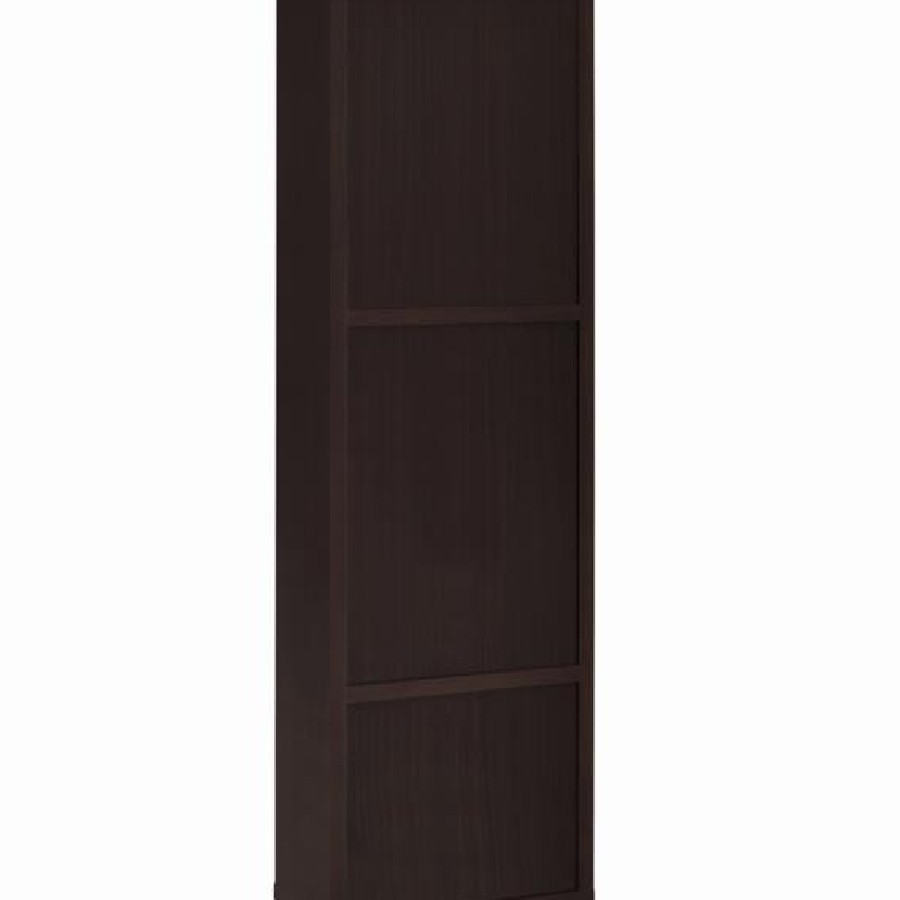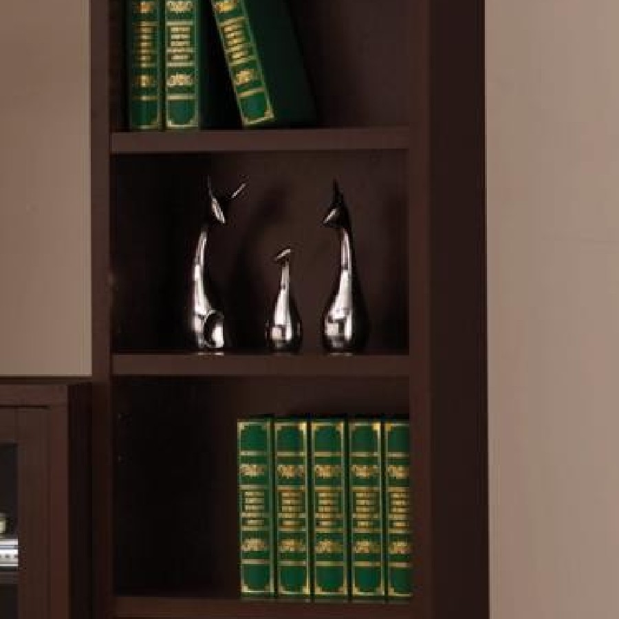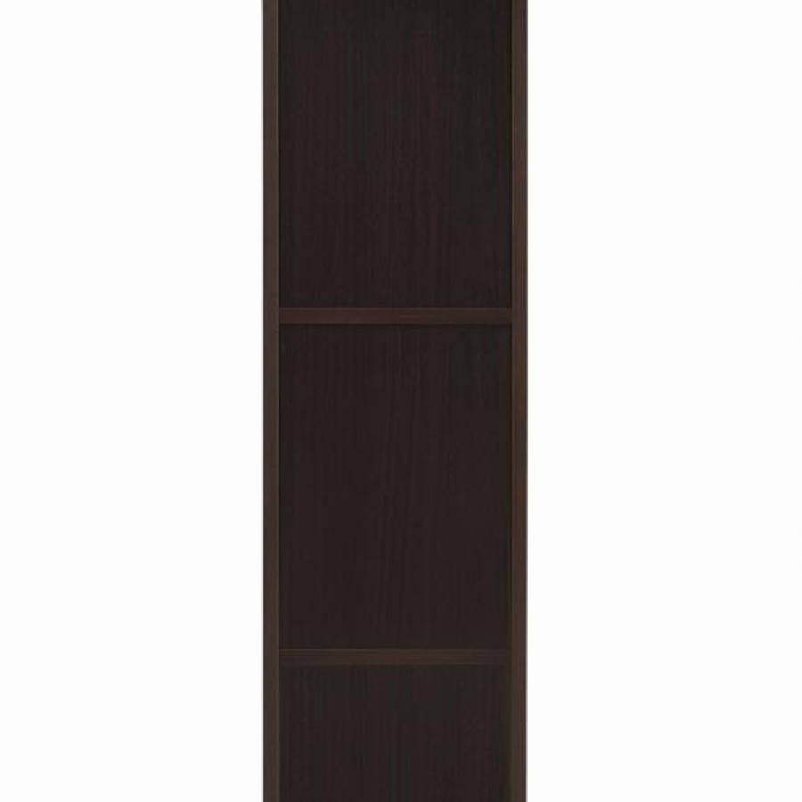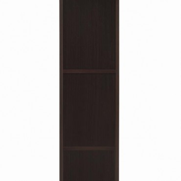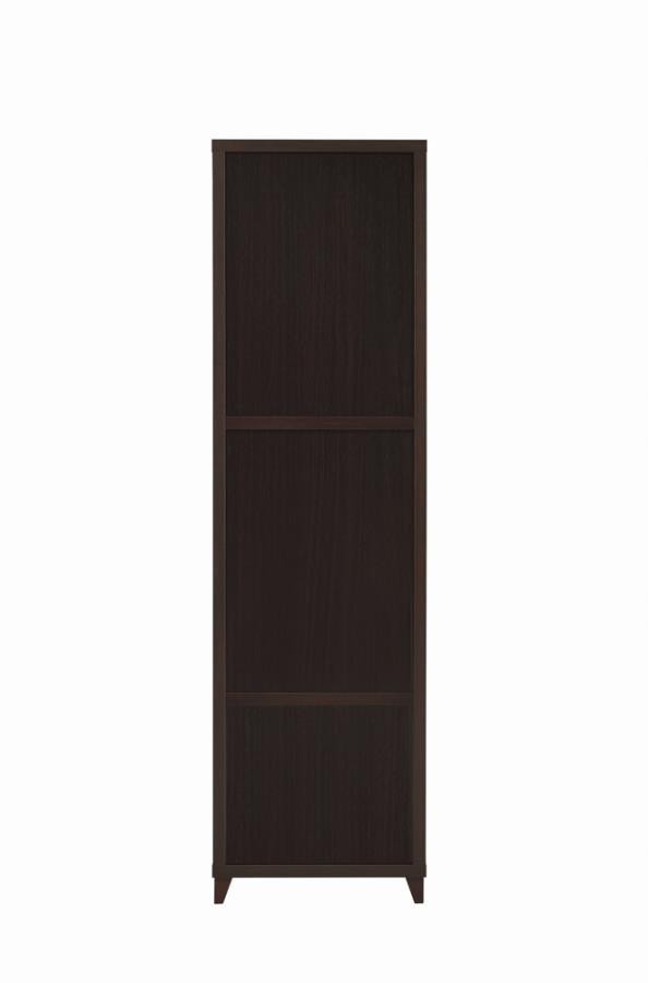 Elevate your entertainment area with this versatile media tower, designed with sleek lines and a cappuccino finish for contemporary appeal. Four open shelves provide ample space to display books, decor, or media devices, while adjustable shelving adds flexibility for customized storage. Two spacious drawers at the base keep accessories neatly tucked away, complemented by brushed silver hardware for a modern touch. Supported by tapered legs, this tower combines practical function with a stylish silhouette to complete your living space.
