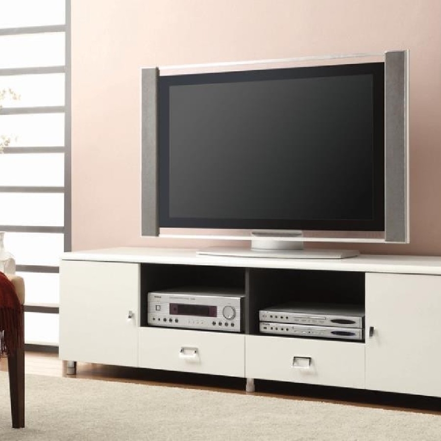 Update any modern living space with stylish appeal. This stunning TV console exudes class, convenience, and contemporary flair. Its high-gloss white frame is boldly accented by the cool, gunmetal finish of its sides. Curved, chrome hardware completes its attractive look with a dazzling touch of shine. Complete with multiple drawers, cabinets, and compartments, this console helps you stay organized with plenty of storage space.