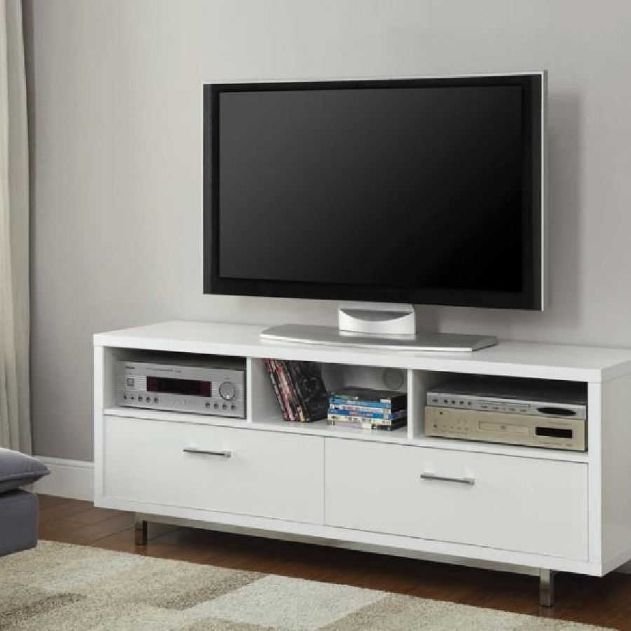 Ideal for a living room with contemporary decor, this TV console exudes updated style. The dazzling shine of chrome combines with a crisp, clean white finish for a pleasingly modern look. Its chic silhouette is complete with an elegant brushed silver frame, adding a pleasing touch of polish. Endlessly versatile, it features three open storage compartments and two large lower drawers to easily keep your space organized. For added depth and a more subdued look, this console is also available in deep, rich cappuccino.