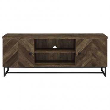 This rustic TV console offers a modern touch to a farmhouse style living room. A rustic oak finish showcases the classic herringbone pattern across the double cabinet doors. Supported on a metal trestle base in a gunmetal finish that offers an industrial flair, this TV console offers plenty of support while lifting the furniture piece over a rug and offering extra space beneath for baskets and organization. Inside each cabinet is a single adjustable shelf that may be lowered or raised as needed. In the center of this console are two open shelves for a gaming console and other entertainment systems.