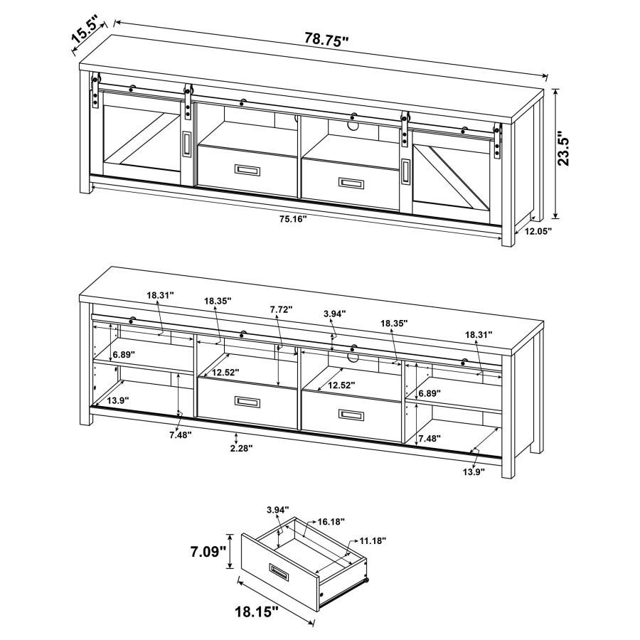 Wood-like finishes and country-inspired elements create this rustic style TV console. Keep entertainment consoles, a stereo and more tucked neatly within two open shelves toward the center. Disguised by sliding barn doors mounted on black hardware that lend an industrial touch, this television console also stores away entire collections of movies, games and music. With its long rectangular design and clean square edges, this console furniture piece makes an excellent addition to entertainment rooms and living rooms. This TV console makes a charming, versatile piece for your entire entertainment system setup.