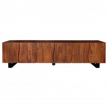 This spacious TV stand is crafted from solid mango wood, offering ample storage with its six doors and adjustable shelves. The mango brown finish highlights the natural beauty of the wood grain, giving it a warm and timeless look. Curved panel details on the doors add a modern touch, while interior shelves provide versatile organization options. Supported by sturdy metal legs, the sideboard blends rustic charm with industrial durability, complete with cable cutouts for media management.