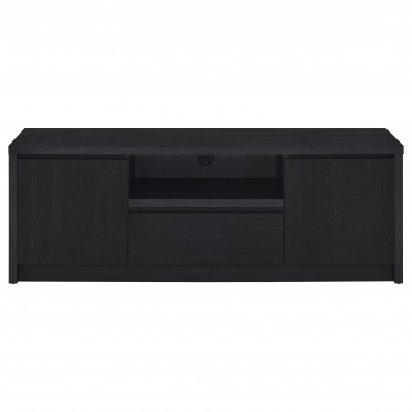 This modern entertainment center combines a sleek TV stand with two matching media towers, offering style and functionality. Finished in a bold black with a scratch-resistant eco-friendly laminate veneer, this unit provides ample storage and display options. The TV stand features cabinets, an open shelf with cable management, and a wide drawer, while each media tower includes open shelves and a bottom cabinet for organized storage. Perfect for creating a cohesive entertainment space in any living room.