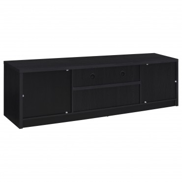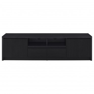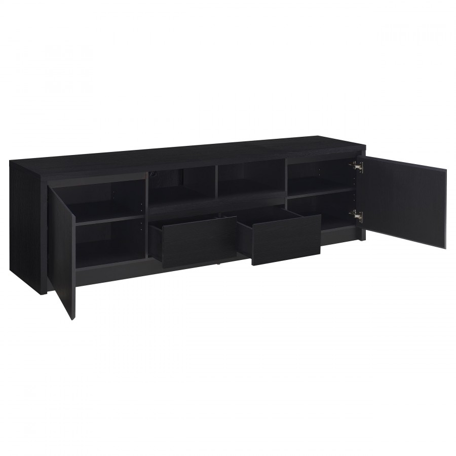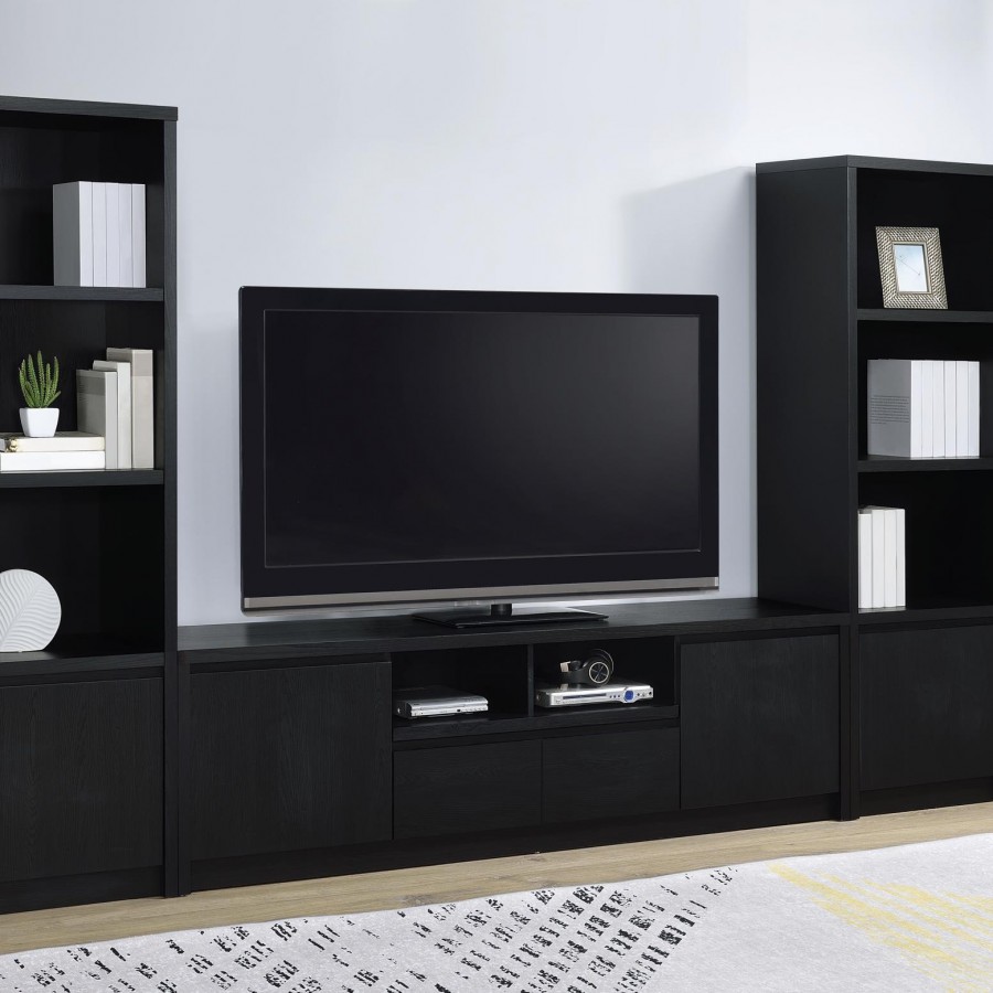This modern entertainment center combines a sleek TV stand with two matching media towers, offering style and functionality. Finished in a bold black with a scratch-resistant eco-friendly laminate veneer, this unit provides ample storage and display options. The TV stand features cabinets, an open shelf with cable management, and a wide drawer, while each media tower includes open shelves and a bottom cabinet for organized storage. Perfect for creating a cohesive entertainment space in any living room.