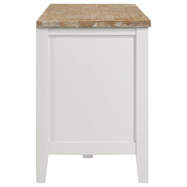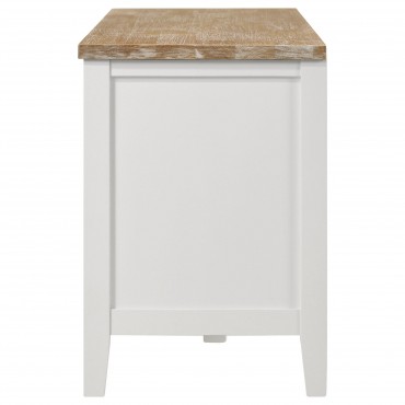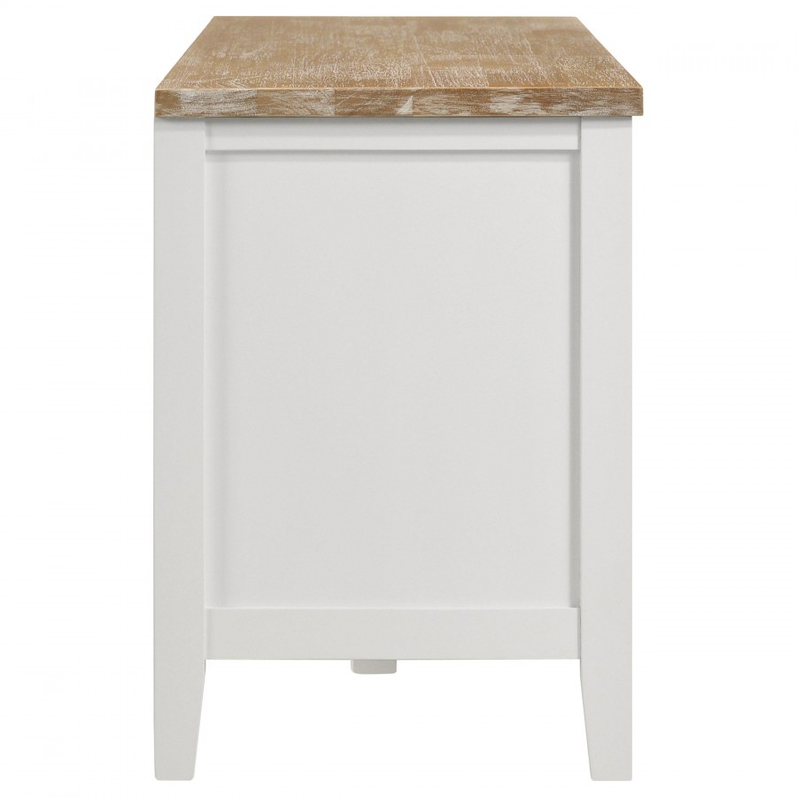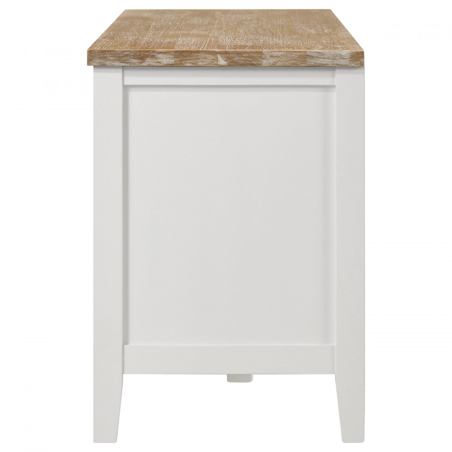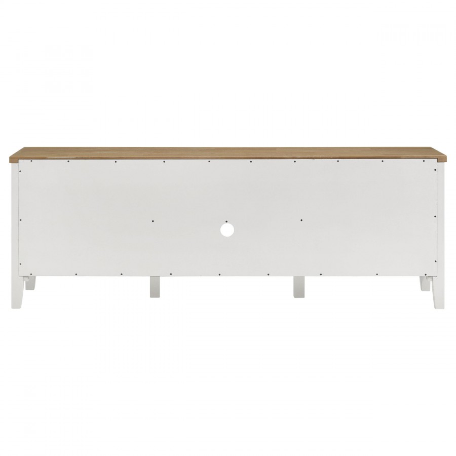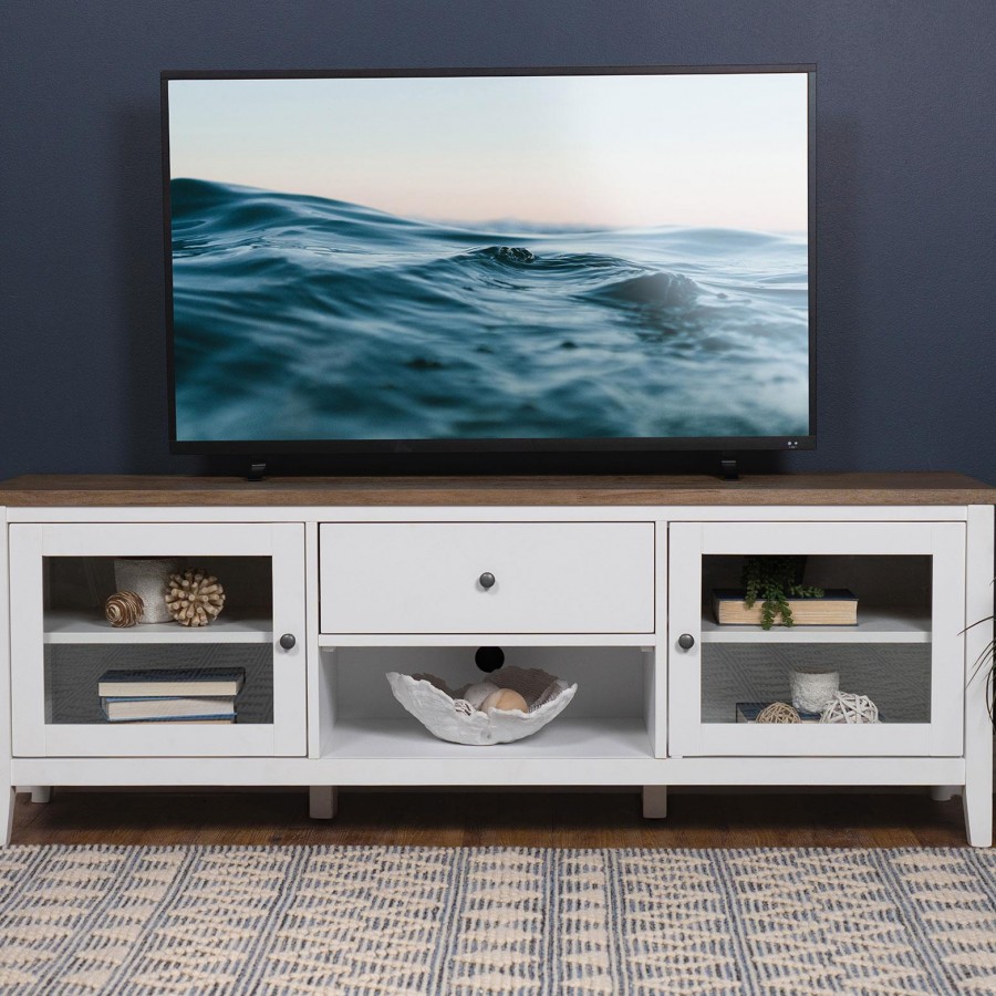 Versatility is a definite plus in the design of this charming transitional wood TV stand. Spacious and equipped with plenty of storage room, this console creates a breezy look with cottage, coastal, and farmhouse influence. A rectangular brown finish ash wood top provides a breathtaking contrast to a white finished frame. Place components in a center open space and on adjustable shelving behind two glass-front doors, and stash media and accessories in a large slide-out drawer. This all-in-one console organizes entertainment devices and accessories to make sure your media viewing is smooth and easily accessible.
