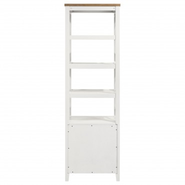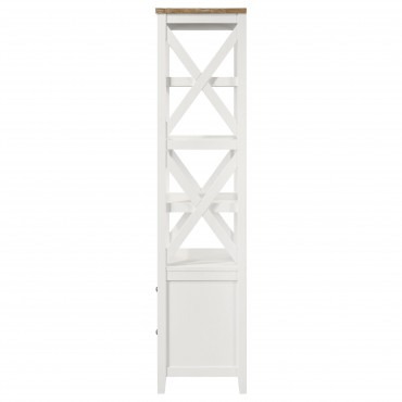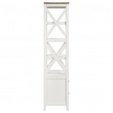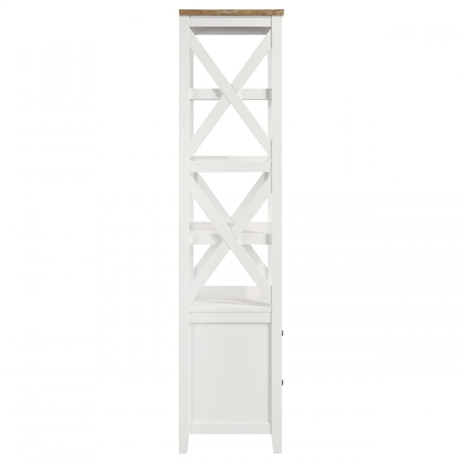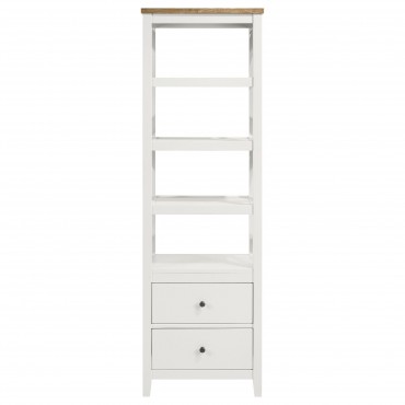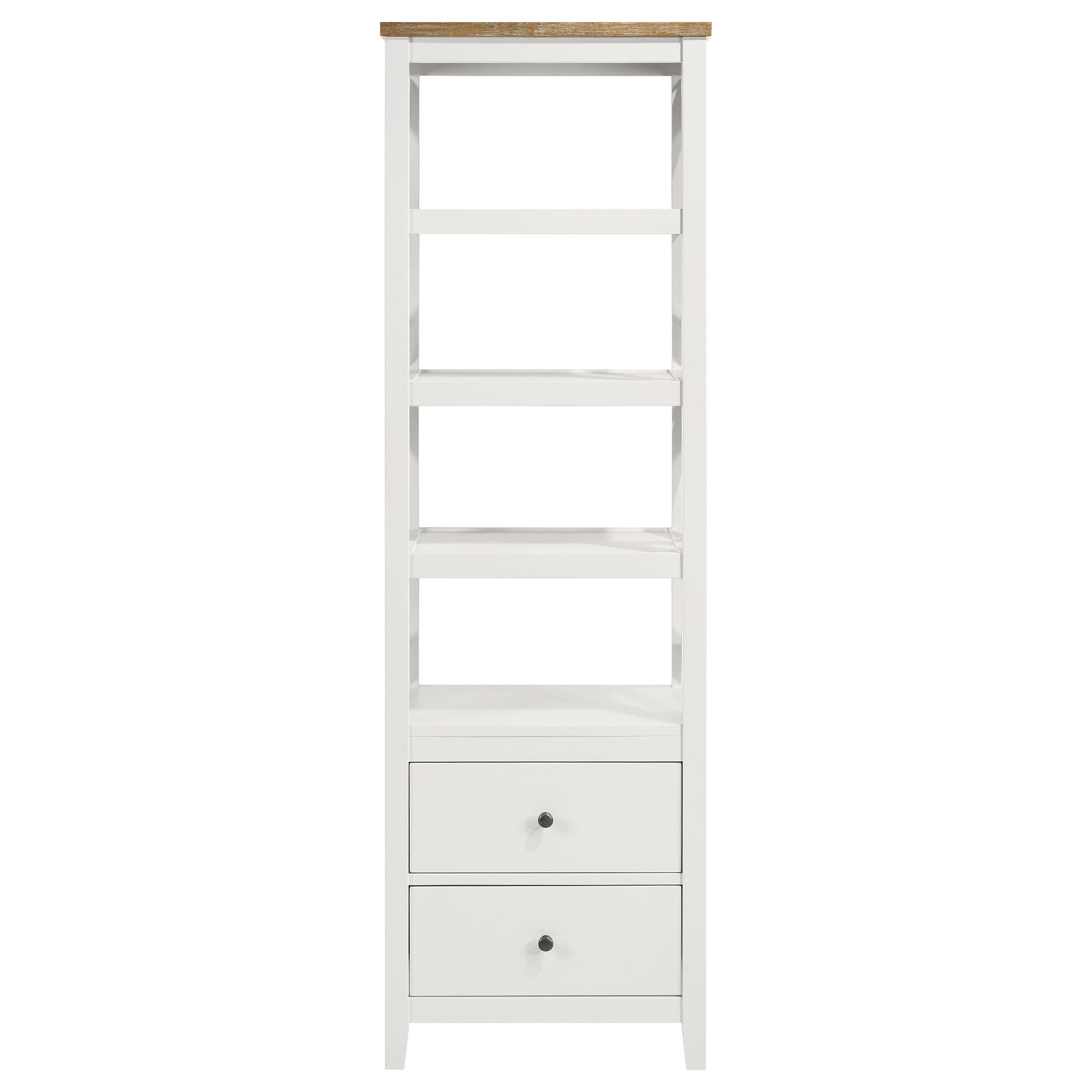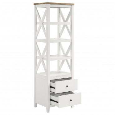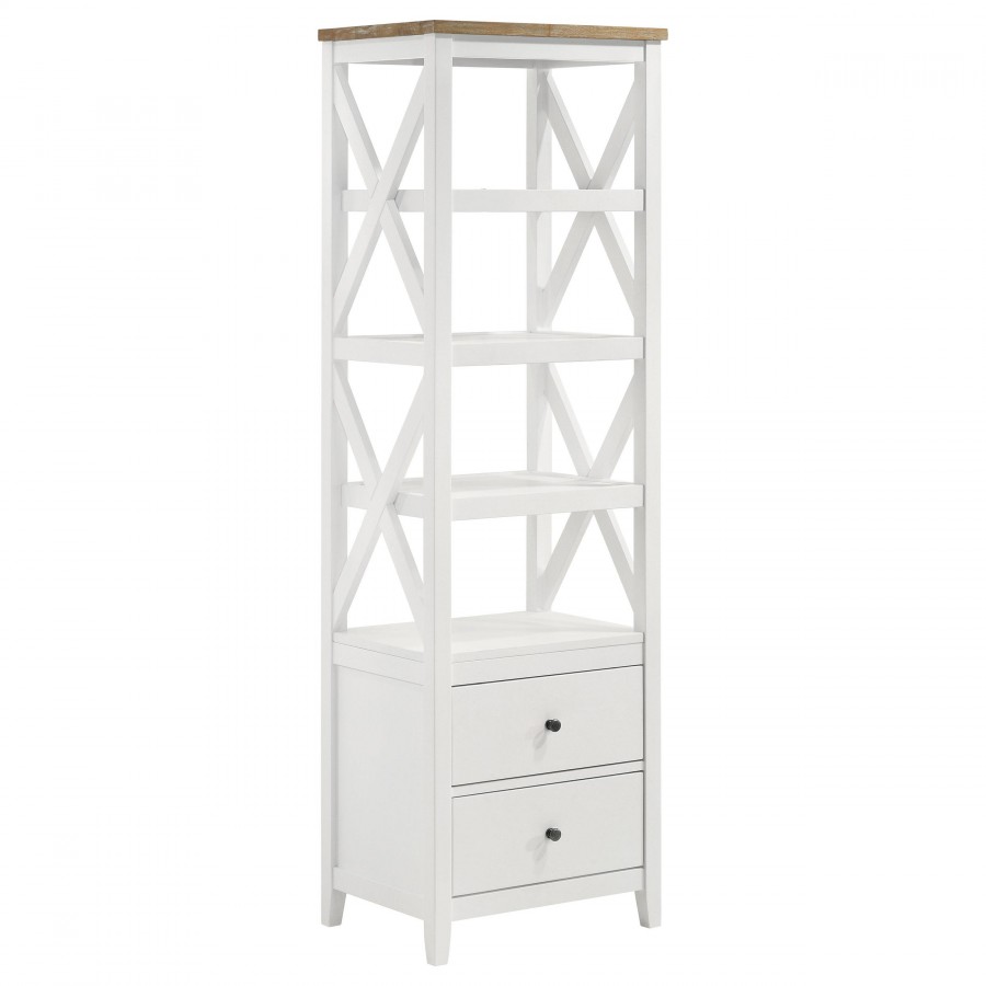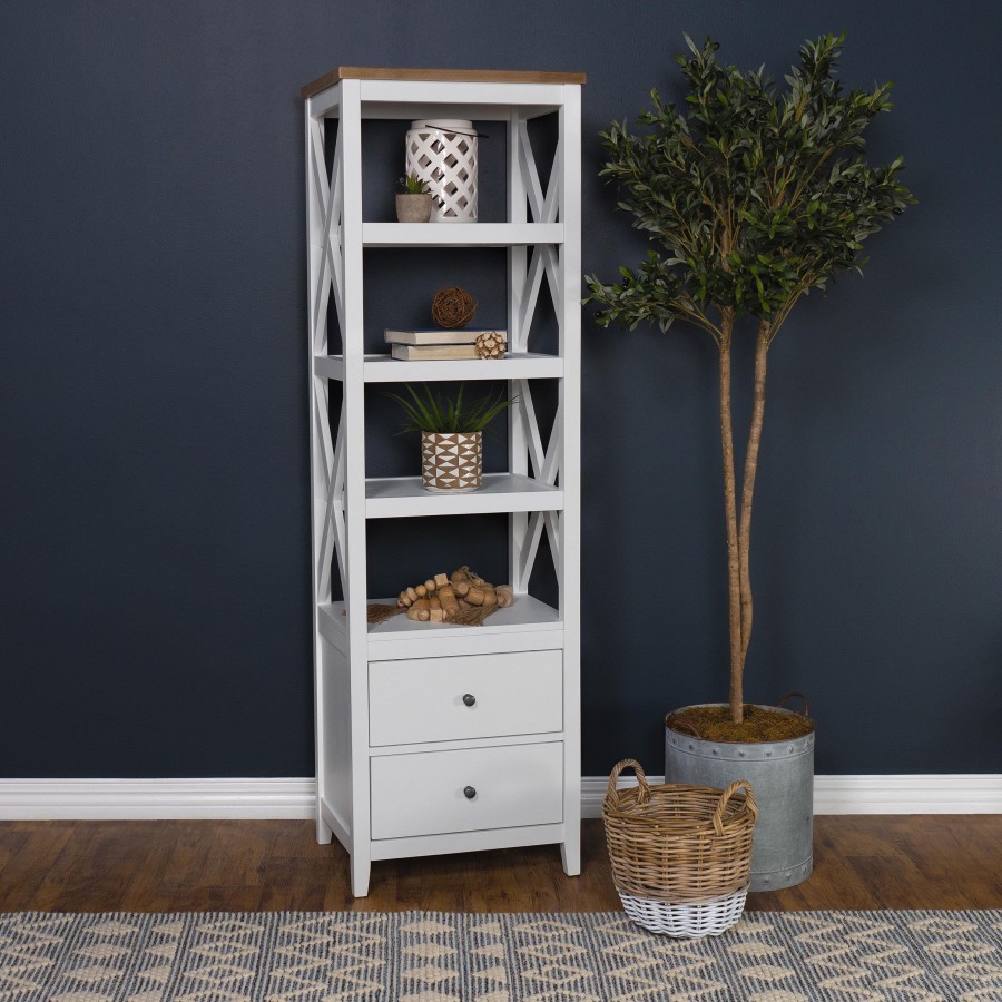 Spacious or compact, a casual living space has storage needs, and this wood media tower is a solid choice. Organize books and implements neatly while adding a fresh, inspiring look to a living room or family room. This modern tower is a mix of cottage-style, coastal, and rustic farmhouse, offering a superbly versatile fit. White finish wood construction features a four-shelf open bookcase above a two-drawer storage unit with full-drawer extension glides, as an eye-catching geometric look places X-shape elements on each side of its open bookcase. A brown finished ash veneer top changes up the style to add even more design flexibility.
