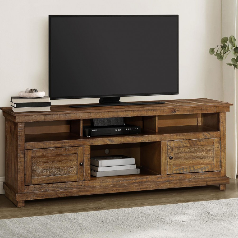 Introduce expansive storage underneath your flat panel television with this modern farmhouse TV stand. It's a wooden design with roughhewn details that offer charming texture and casual allure in your living room or den. Two cabinets offer decorative doors while providing plenty of interior storage that helps to create a tidy look in your living room. Two open shelves create space for media and gaming components mixed with decor that offers a personalized touch. Cord management openings complete the design, making for a streamlined design that accommodates televisions up to 75 inches placed on top or mounted above.