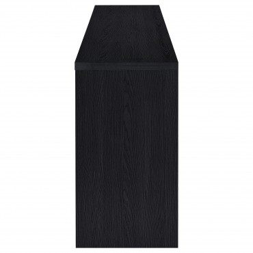 This expansive media console merges bold presence with discreet practicality. Framed in a striking black finish, four glass doors reveal warm wood-look interiors with hidden drawers behind each panel—perfect for tucking away remotes, devices, and essentials. The broad surface accommodates TVs up to 85 inches, while fixed shelving enhances display or storage flexibility. Crafted from engineered wood and clear glass with black hardware, it delivers a grounded, modern-rustic statement for any living room.