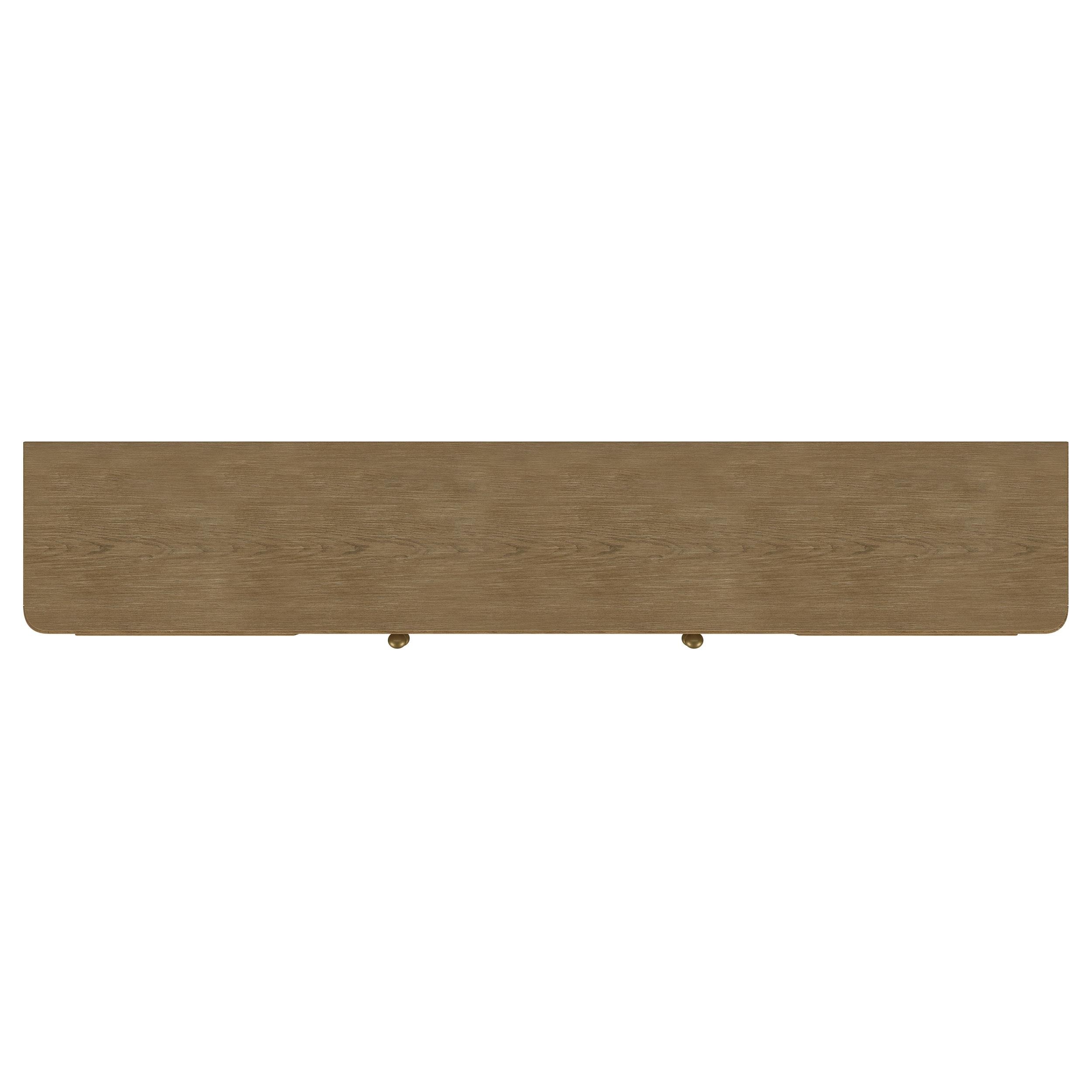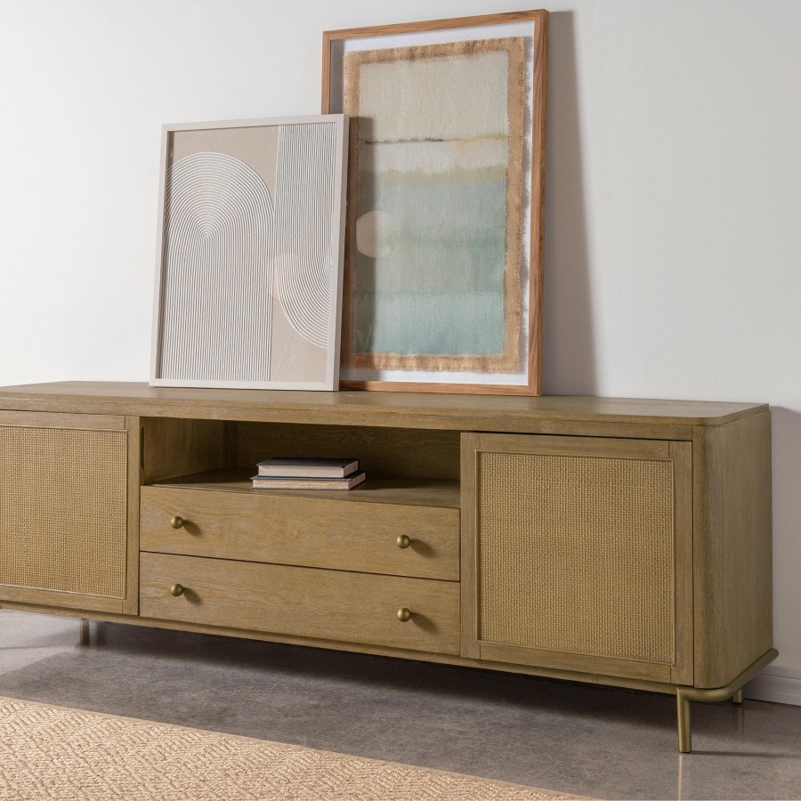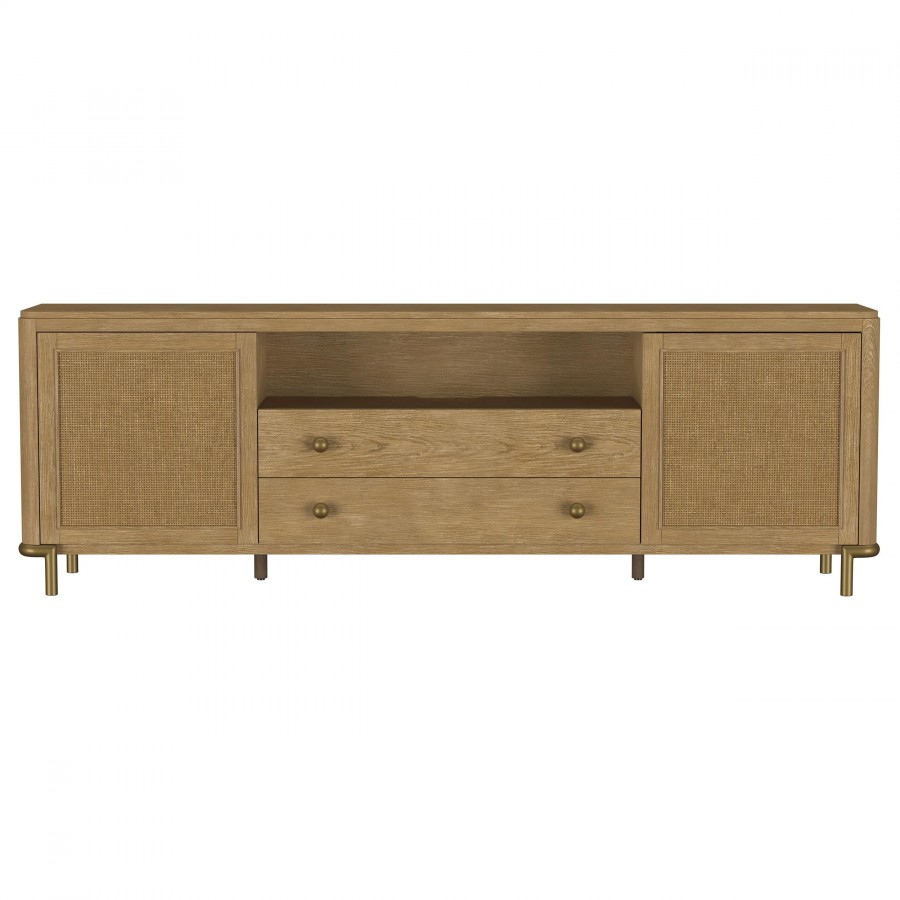 This refined entertainment unit transforms your living room with artisanal detail. Accommodating up to 85-inch displays, this TV stand integrates rubberwood, engineered wood, white ash veneer, and rattan. A modern neutral finish and aged brass legs exude timeless appeal. With drawers and hidden storage, it excels as a media console or TV shelf. A versatile TV console and media stand, it ensures an elegant entertainment center and functional media cabinet.