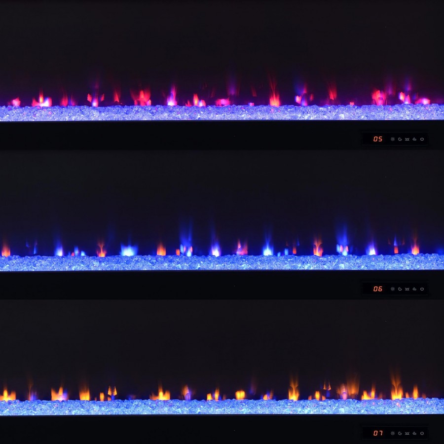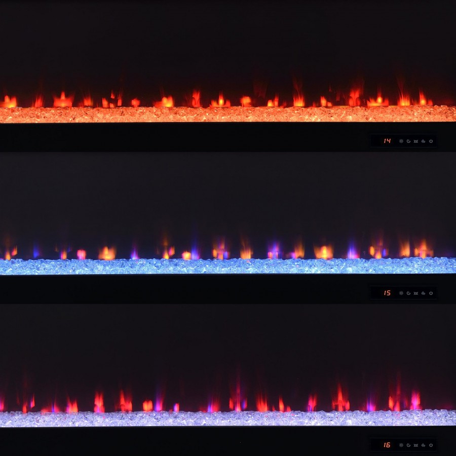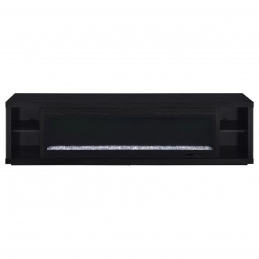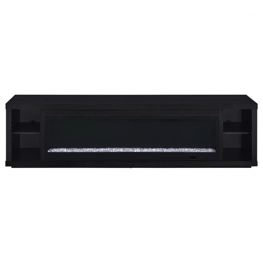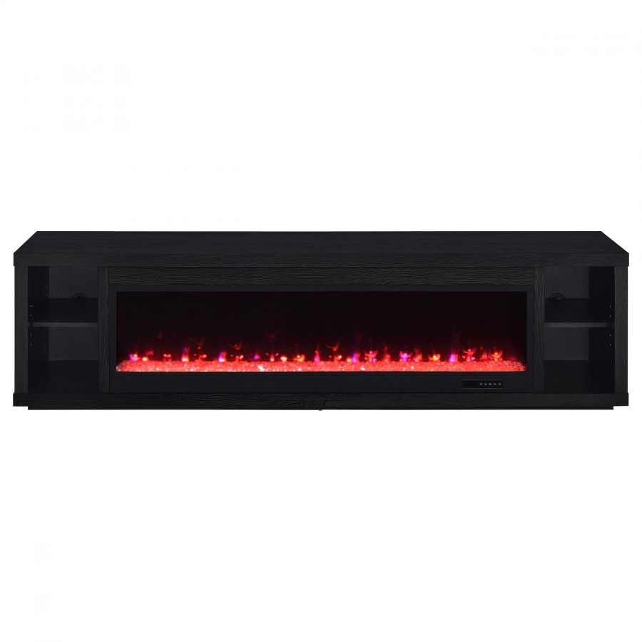 This sleek fireplace media console brings warmth and streamlined storage to contemporary living spaces. A wide electric firebox glows over crushed acrylic crystals, offering fifteen customizable flame colors operated by a wireless remote. Open side compartments with adjustable shelves store devices or décor, while rear cable management cutouts keep wires out of sight. Finished in classic black and crafted from engineered wood with a laminate veneer, it serves as a refined TV stand or entertainment center. Please note that this console does not include a heat function.