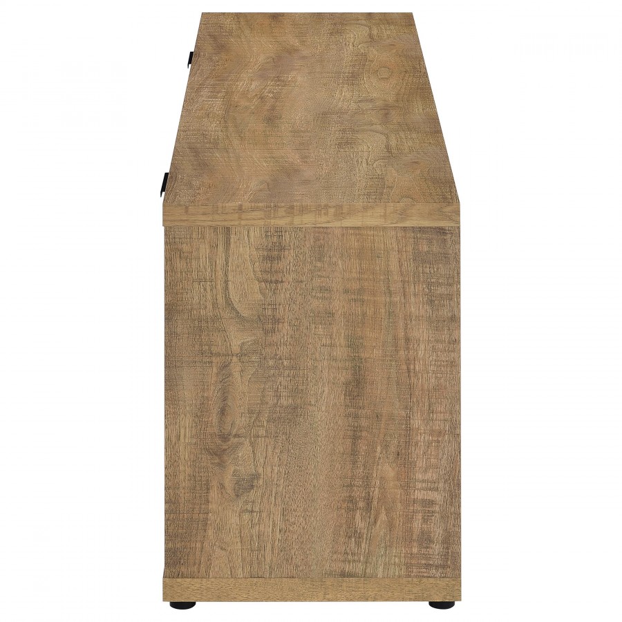 This fireplace media console brings warmth, storage, and charm to any living room or entertainment space. A built-in electric firebox with wireless remote control glows from the center, flanked by dual cabinets with adjustable shelves to neatly store electronics or accessories. The open cubby offers easy access to media components, while a mango wood-look finish adds natural appeal. Crafted from engineered wood with a durable laminate veneer, it functions as a TV stand, media cabinet, or entertainment center. Please note that this console does not include a heat function.
