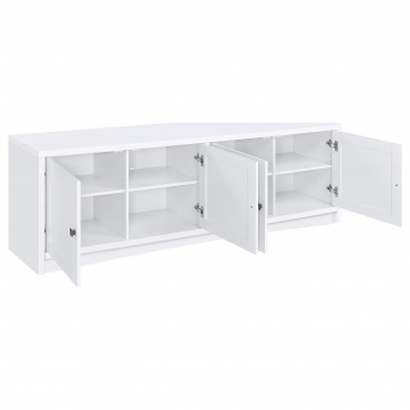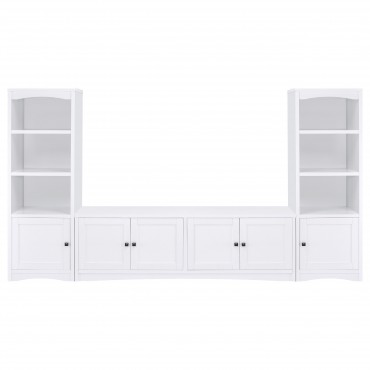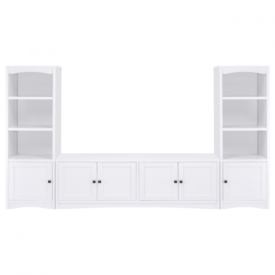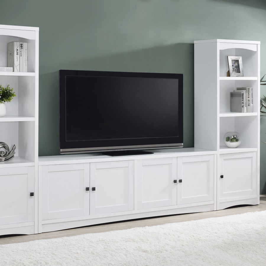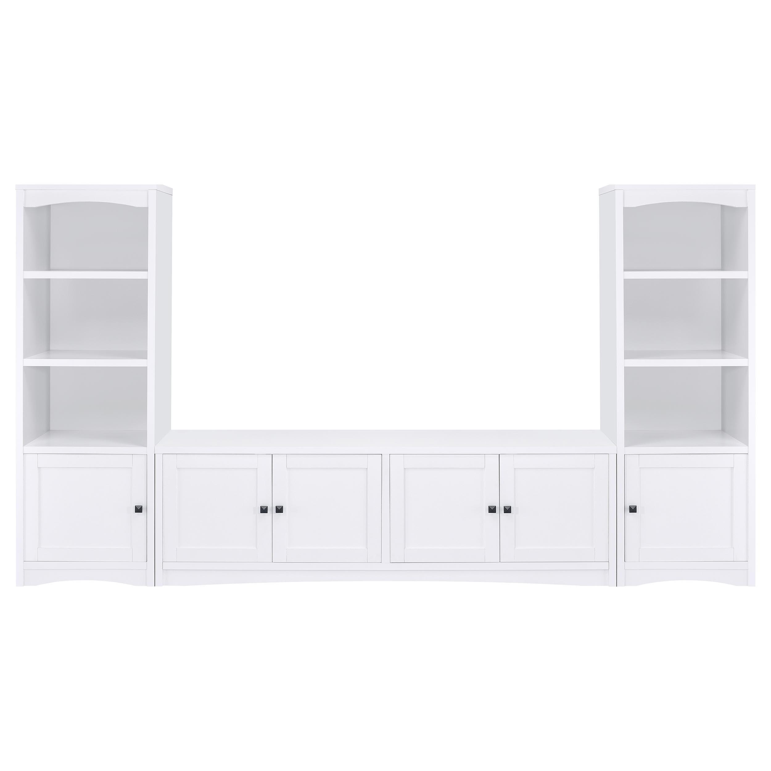 Transform your living space with this beautifully crafted entertainment center, designed to combine style and functionality for your media needs. Anchored by a 78-inch TV stand, this set is perfect for hosting up to an 85-inch television, offering a spacious and organized solution for your home. The TV stand features four doors that open to adjustable shelves, complete with cord management openings, making it easy to keep your media and gaming components neatly arranged. Flanked by two matching media towers, the entertainment center provides additional storage and display options with a mix of open shelving and concealed cabinet space. Finished in a warm, neutral tone, this entertainment center blends seamlessly with any decor, creating an inviting focal point in your living room.